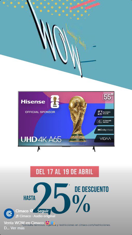 Les comparto la Venta Wow de las tiendas departamentales Cimaco, en la que te darán hasta un 25% de descuento en productos seleccionados como Pantallas, Computadoras, Línea blanca, Colchones y más; la promoción aplica en artículos participantes, es válida en su tienda en línea www.cimaco.com y en sus sucursales físicas (las puedes ubicar en este enlace: www.cimaco.com.mx/sucursales) y estará vigente del 17 al 19 de abril de 2026.