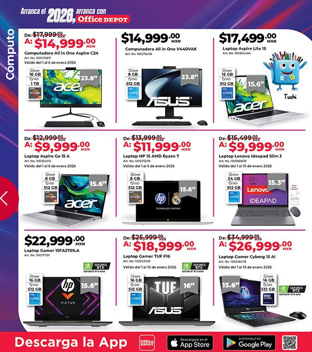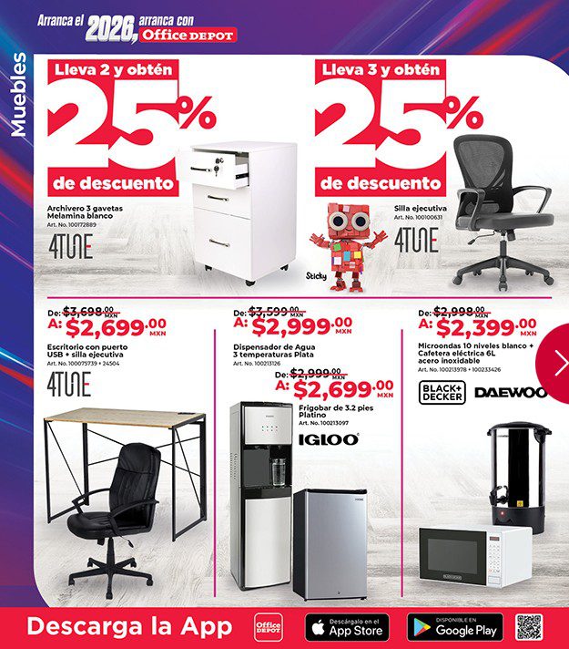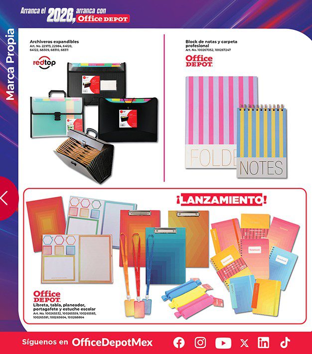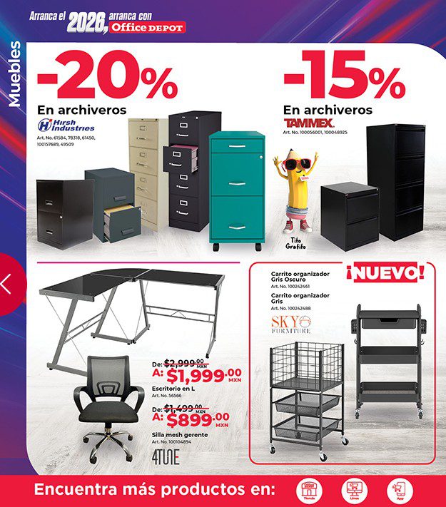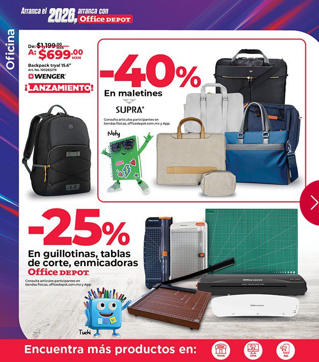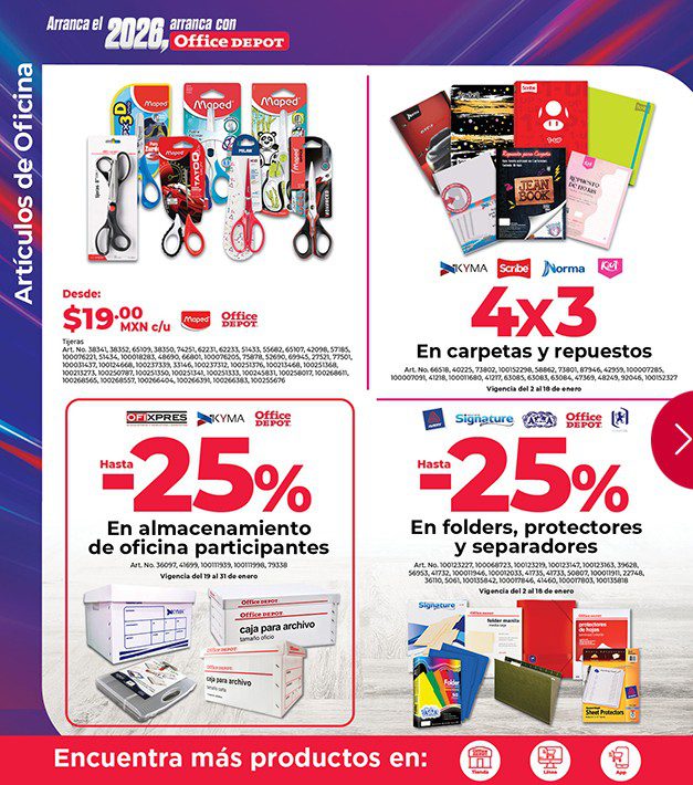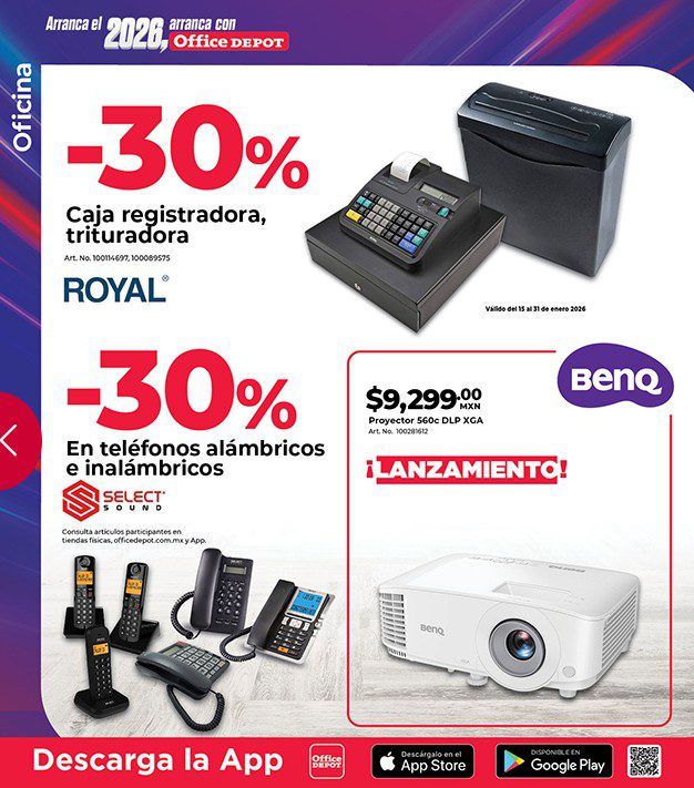 Hace un momento vi el folleto Arranca el 2026 con Office Depot, en el que encontrarás 4×3, hasta un 50% de descuento, Ahorros especiales en la compra de determinadas unidades, Ofertas en productos de Marca Propia, Precios especiales y hasta 6 Meses sin intereses si pagas con tarjetas participantes; las ofertas son válidas en productos seleccionados, cuenta con una vigencia del 01 al 31 de enero de 2026 y aplican tanto en su tienda en línea officedepot.com.mx, como en su App (que puedes descargar desde esa misma página) y en sus sucursales físicas.