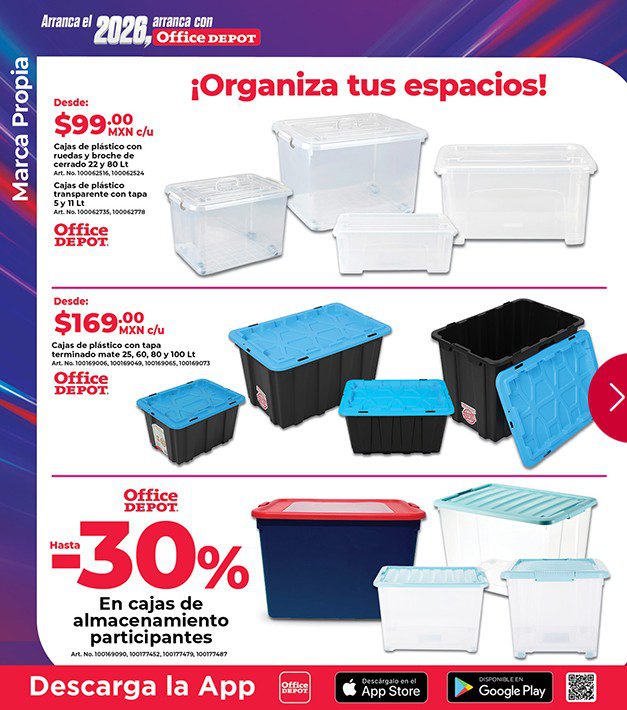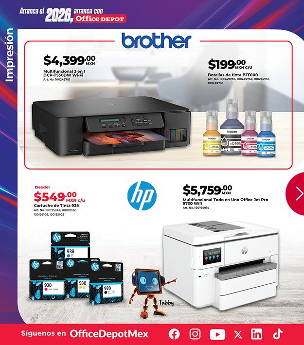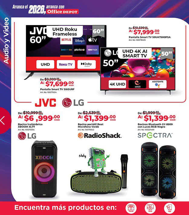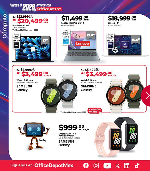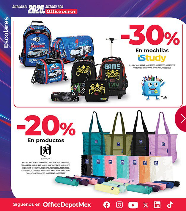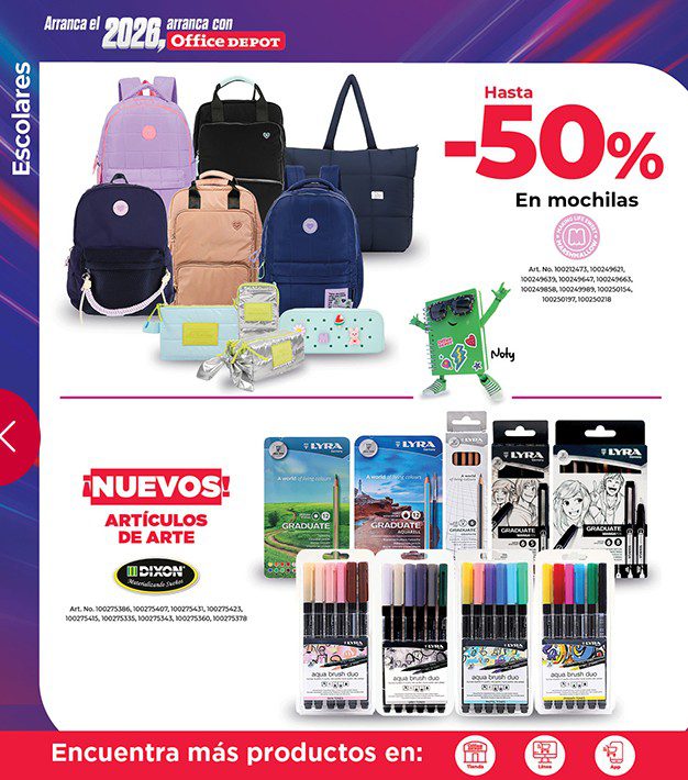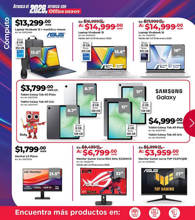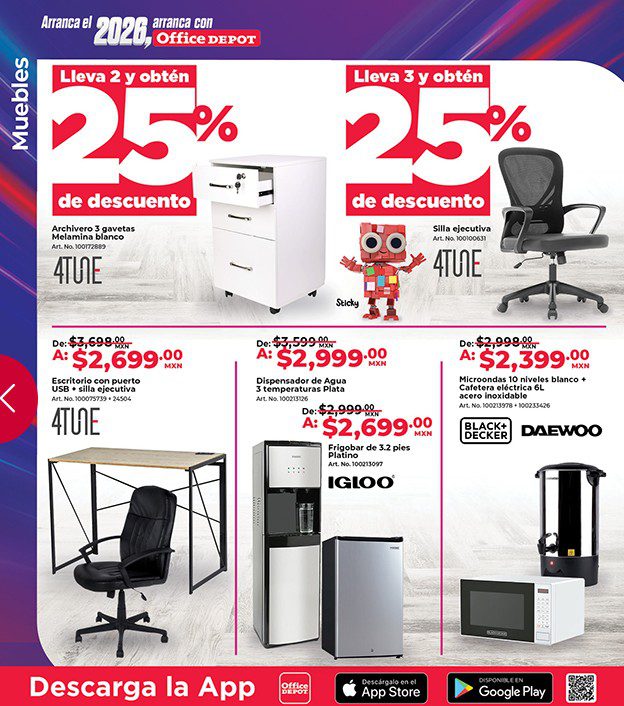 Hace un momento vi el folleto Arranca el 2026 con Office Depot, en el que encontrarás 4×3, hasta un 50% de descuento, Ahorros especiales en la compra de determinadas unidades, Ofertas en productos de Marca Propia, Precios especiales y hasta 6 Meses sin intereses si pagas con tarjetas participantes; las ofertas son válidas en productos seleccionados, cuenta con una vigencia del 01 al 31 de enero de 2026 y aplican tanto en su tienda en línea officedepot.com.mx, como en su App (que puedes descargar desde esa misma página) y en sus sucursales físicas.