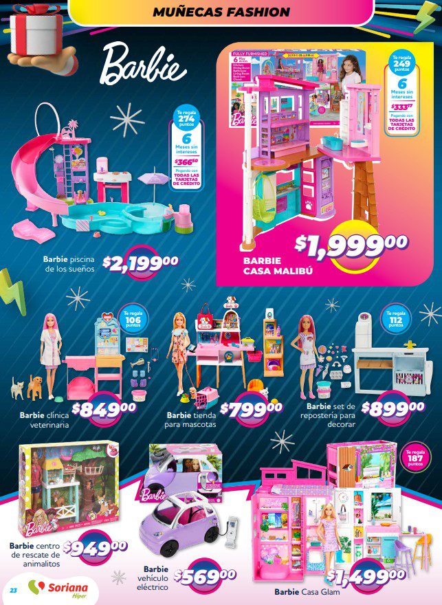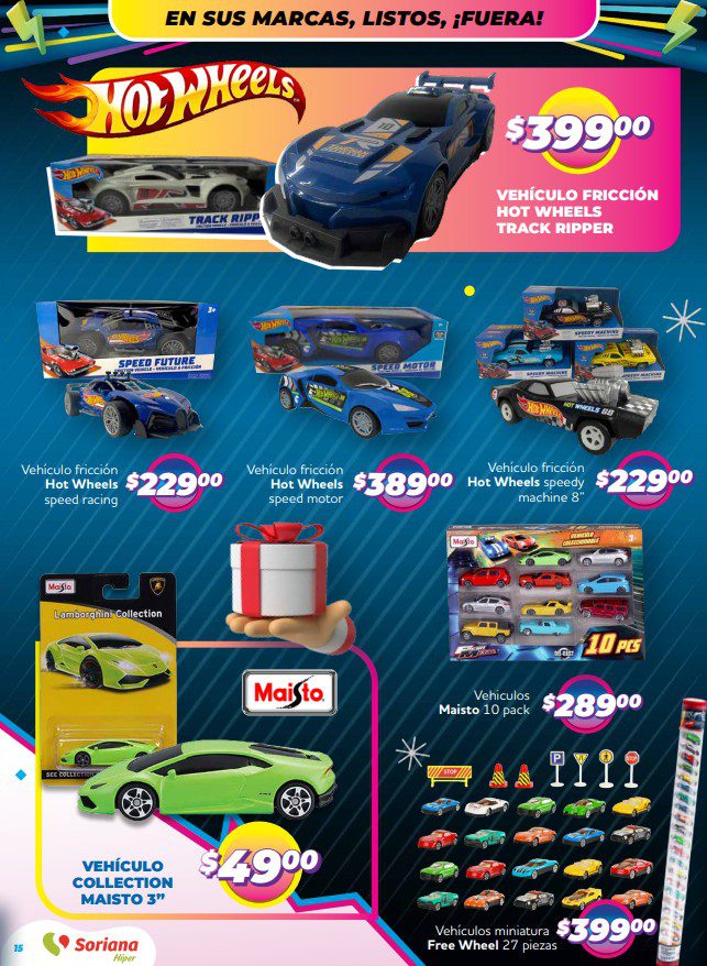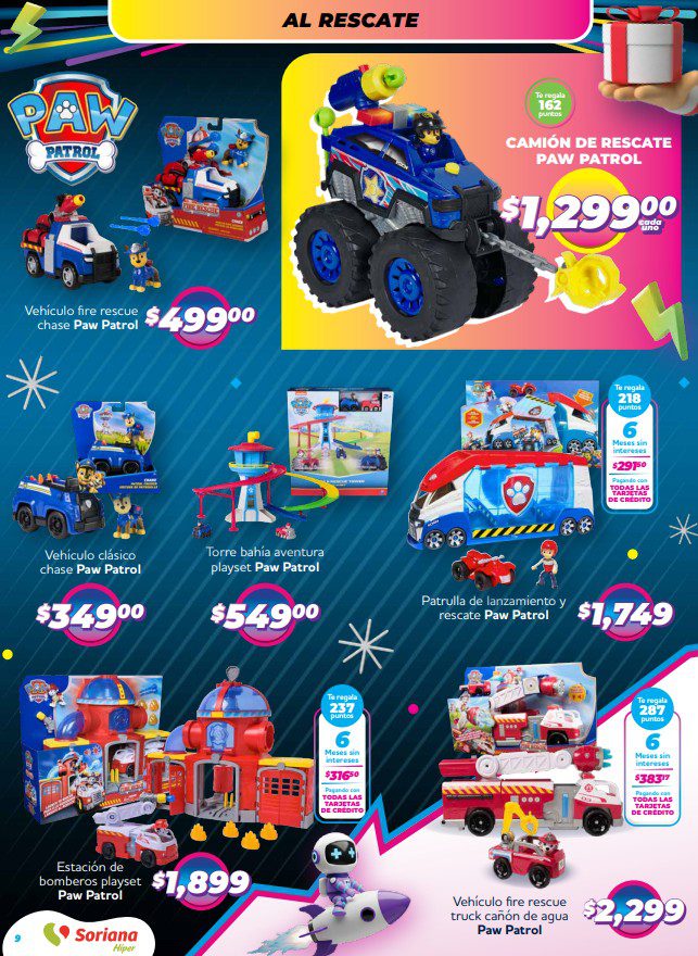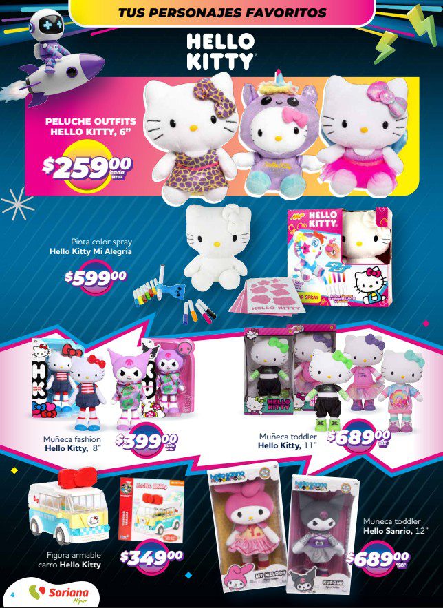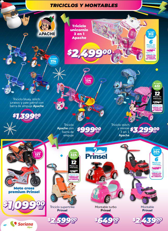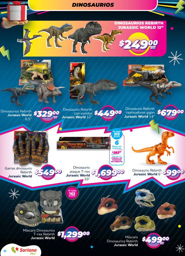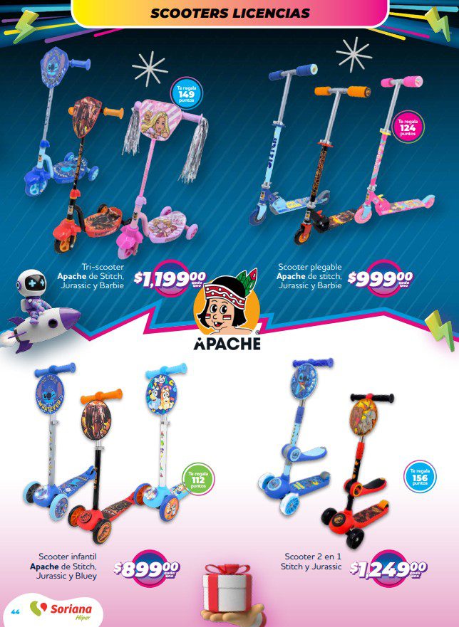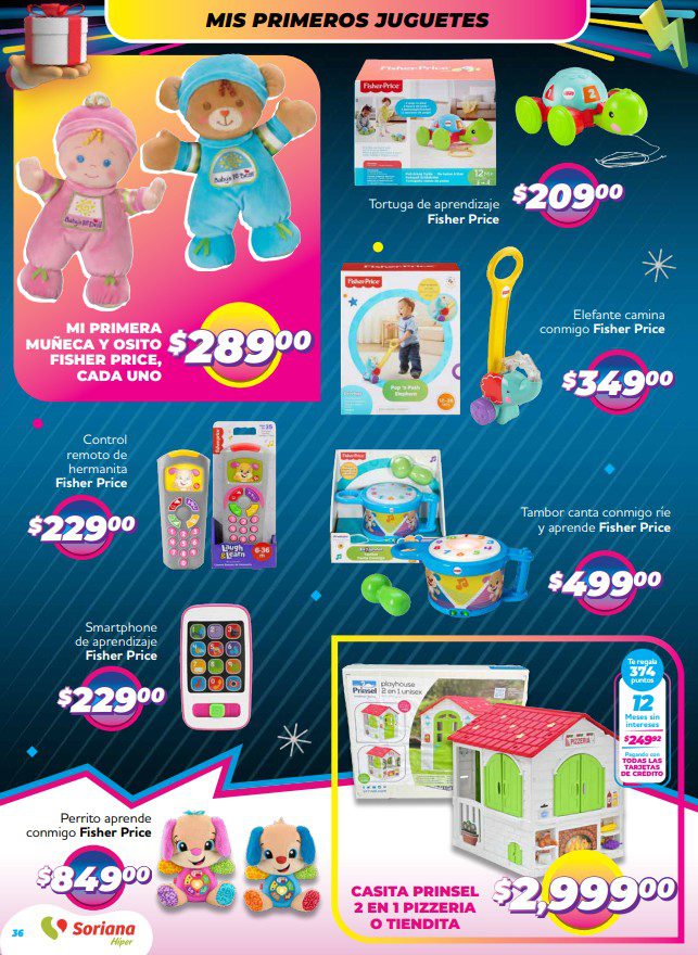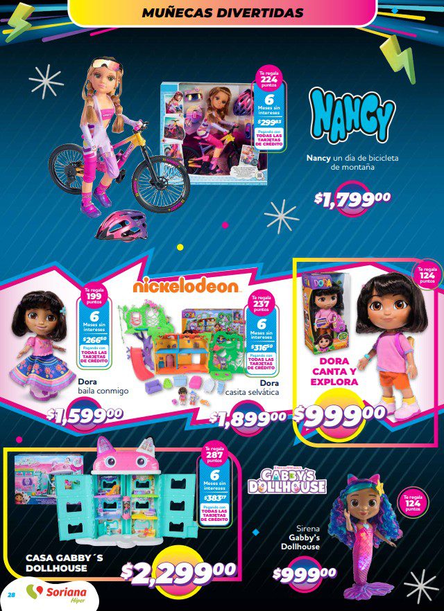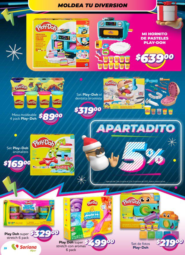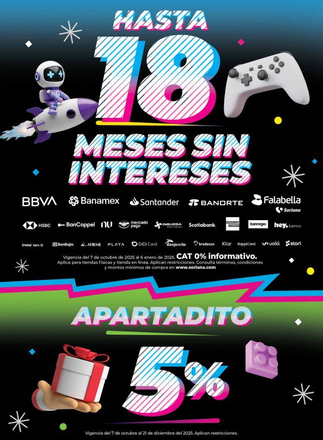 Hace un momento vi el folleto Reino de los Juguetes de Soriana Híper y Súper, que contiene sus ofertas válidas del 27 de noviembre al 11 de diciembre de 2025 o agotar existencias, y en el que encontrarás Precios especiales, hasta 18 Meses sin intereses con tarjetas participantes y Apartadito (puedes apartarlos con un 5% de su valor); las ofertas son válidas en artículos seleccionados y aplican en sus sucursales físicas y en su página web www.soriana.com.