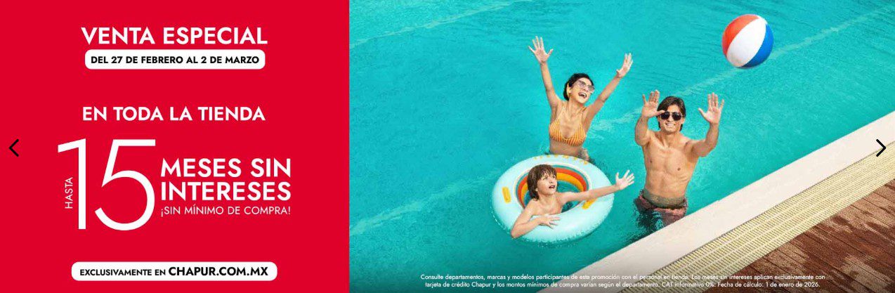 A partir de hoy viernes 27 de febrero y hasta el lunes 02 de marzo de 2026, en Gran Chapur estará su Venta Especial, en la que encontrarás hasta 15 Meses sin intereses en toda la tienda (con Tarjeta Chapur y sin mínimo de compra); las ofertas aplica en artículos participantes de Muebles, Aires acondicionados, Tecnología, Hogar y Línea blanca, son válidas exclusivamente en su tienda en línea chapur.com.mx.