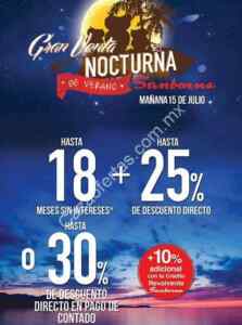 Sanborns anuncia que su próxima Venta Nocturna es mañana 15 de julio de 7:30 am hasta la 1 de la madrugada, con hasta 30% de descuento en toda la tienda en pago de contado o 25% de descuento + 15 meses sin intereses con tarjetas de crédito (18 MSI con tarjeta Sanborns y Banamex). Quienes paguen con crédito Sanborns obtienen un 10% de descuento adicional en todas sus compras.