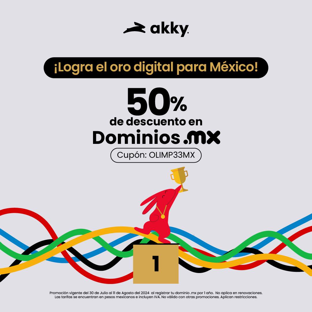 Si estás buscado opciones para colocar tu negocio o proyecto en Internet, te comento que el proveedor de nombres de dominios web Akky con su promoción ¡Logra el Oro Digital para México!, te ofrece un 50% de descuento en dominios .mx al registrar tu dominio por 1 Año; la promoción estará vigente del 30 de julio al 11 de agosto de 2024 y es válido en su sitio web http://spr.ly/6182cxIrO en el que debes usar el cupón OLIMP33MX.