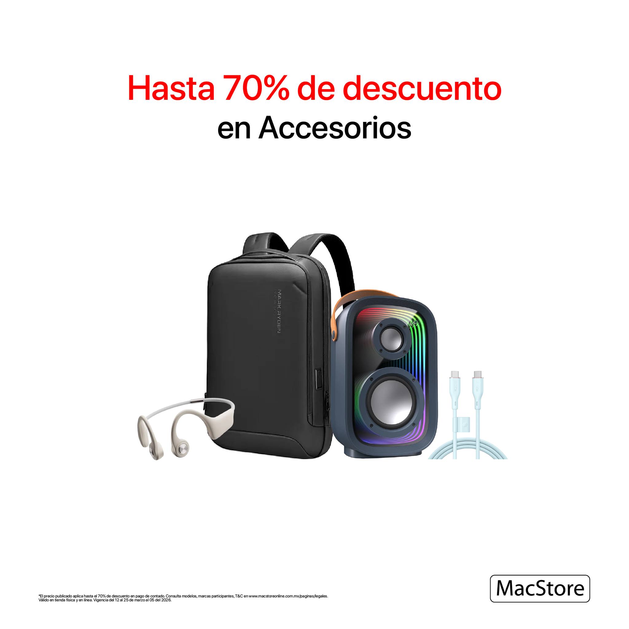 En esta ocasión, en MacStore con su promoción Haz match con tu estilo, te están ofreciendo hasta un 70% de descuento en Accesorios, la promoción aplica en modelos participantes y en pagos de contado, es válida en su tienda en línea www.macstoreonline.com.mx y en sus sucursales físicas (que puedes ubicar en este link: www.macstoreonline.com.mx/lp/sucursales) y estará vigente del 12 al 25 de marzo de 2026.