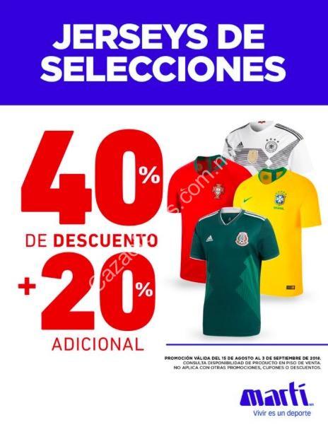 Lo que resta del mes de agosto las tiendas Martí tendrán 40% de descuento + 20 adicional en jerseys seleccionadas y 50% de descuento + 20% adicional en jerseys de clubes de futbol 2017-2018. Pregunten en las sucursales por los modelos disponibles. Ambas promociones estarán vigentes hasta el 3 de septiembre del 2018 por si quieren conseguir la playera de su equipo favorito