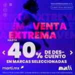 En las tiendas de productos deportivos Martí, ya inició su «Venta Extrema», con la que te darán hasta un 40% de descuento en productos participantes de marcas seleccionadas aun sobre lo ya rebajado y hasta un 20% de descuento en Aparatos seleccionados; la promoción tiene una vigencia del 01 al 18 de octubre de 2020 y puedes realizar tu compra en su página de Internet: marti.mx