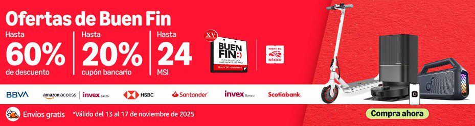 Acabo de darme cuenta que Amazon dio a conocer sus Ofertas del Buen Fin 2025, en la que encontrarás hasta un 60% de descuento + hasta 24 Meses sin intereses + hasta un 20% en Cupón bancario + Envíos Gratis; la promoción es válida en su página de Internet amazon.com.mx y tiene una vigencia del 13 al 17 de noviembre de 2025 y éstas son solo algunas de las ofertas: