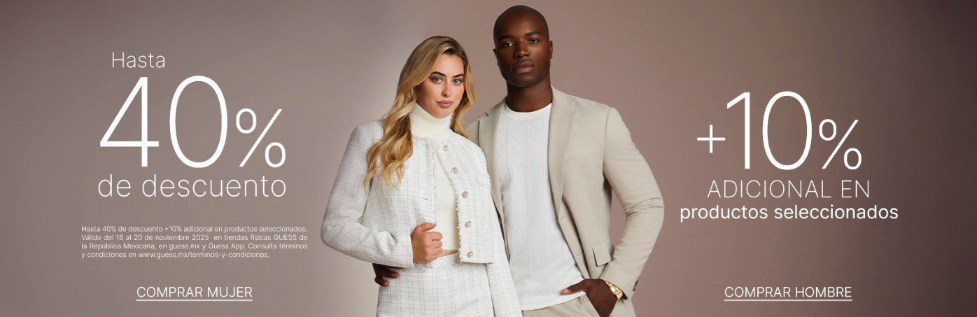 Hasta mañana jueves, estará la promoción del Buen Fin 2025 Extendido de las tiendas de bolsos, ropa y accesorios de moda Guess, en la que te están ofreciendo hasta un 40% de descuento + un 10% de descuento adicional en productos seleccionados de Ropa, Calzado y Accesorios; la vigencia de la promoción es del 18 al 20 de noviembre de 2025 y es válida en su sitio de Internet guess.mx y en sus boutiques físicas.