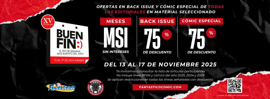 Durante este Fin de semana (del jueves 13 al lunes 17 de noviembre de 2025), en la tienda de comics, revistas y más Fantástico y Comicastle, estará la promoción del Buen Fin 2025, en la que puedes obtener hasta un 75% de descuento en Cómic Especial y Back Issue de todas las Editoriales + Meses sin intereses; la promoción aplica en artículos participantes, es válida en sus sucursales físicas y en su tienda en línea https://fantasticocomic.com/.
