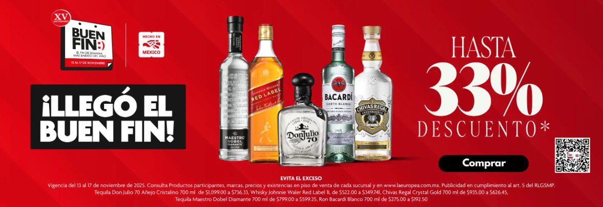 Apenas estoy viendo que en La Europea está su promoción del Buen Fin 2025, con la que podrás obtener hasta un 33% de descuento en Vinos y Licores; la promoción aplica en productos seleccionados, estará vigente del 13 al 17 de noviembre de 2025 o hasta agotar existencias y es válida solo en su sitio web www.laeuropea.com.mx y en sus sucursales físicas.
