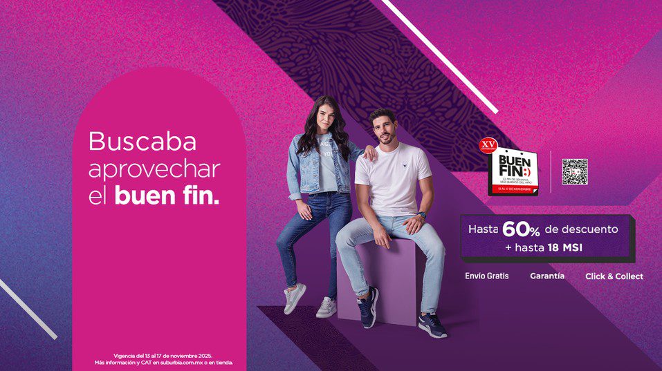 A partir del 13 y hasta el 17 de noviembre de 2025 o hasta agotar existencias, estará la promoción del Buen Fin 2025 de las tiendas departamentales Suburbia, en la que encontrarás hasta un 60% de descuento + hasta 18 Meses sin intereses + Envío Gratis; la promoción aplica en artículos seleccionados, es válida en su tienda en línea suburnia.com.mx, en su App (que puedes descargar desde esa misma página) y en sus sucursales físicas.