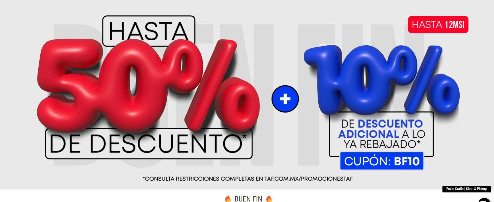 En las tiendas de calzado, indumentaria y accesorios deportivos TAF con su promoción del Buen Fin 2025, te darán hasta un 50% de descuento + un 10% de descuento adicional a lo ya Rebajado (usando el cupón BF10) + hasta 12 Meses sin intereses; la promoción aplica en productos participantes, es válida solo en su tienda en línea www.taf.com.mx y en su App (que puedes descargar desde ese mismo sitio) y solo estará vigente del 13 al 17 de noviembre de 2025.