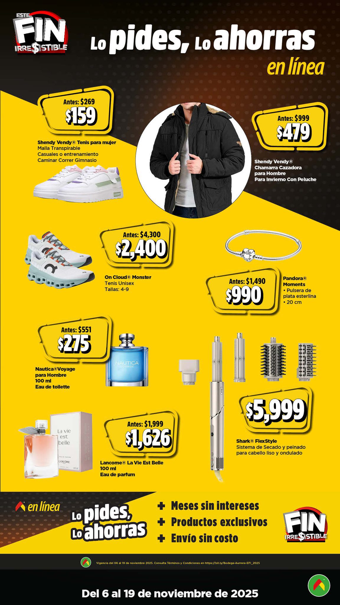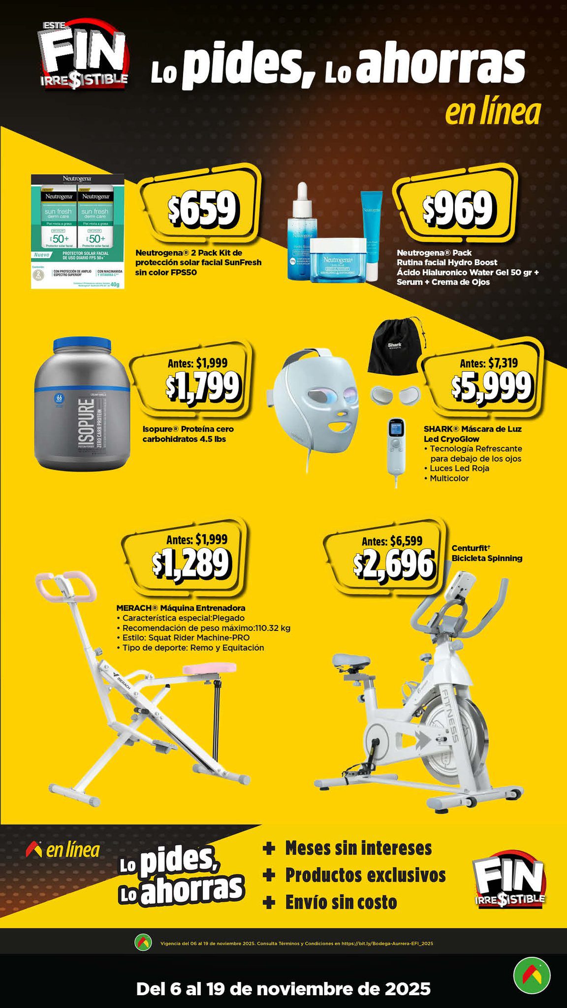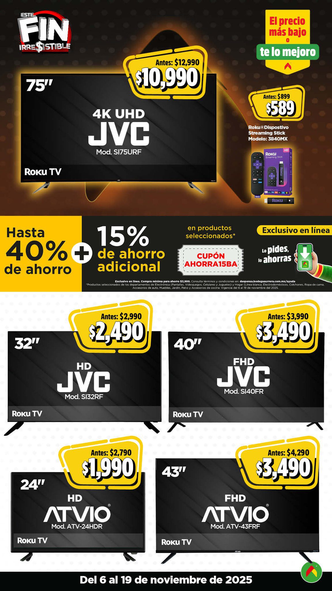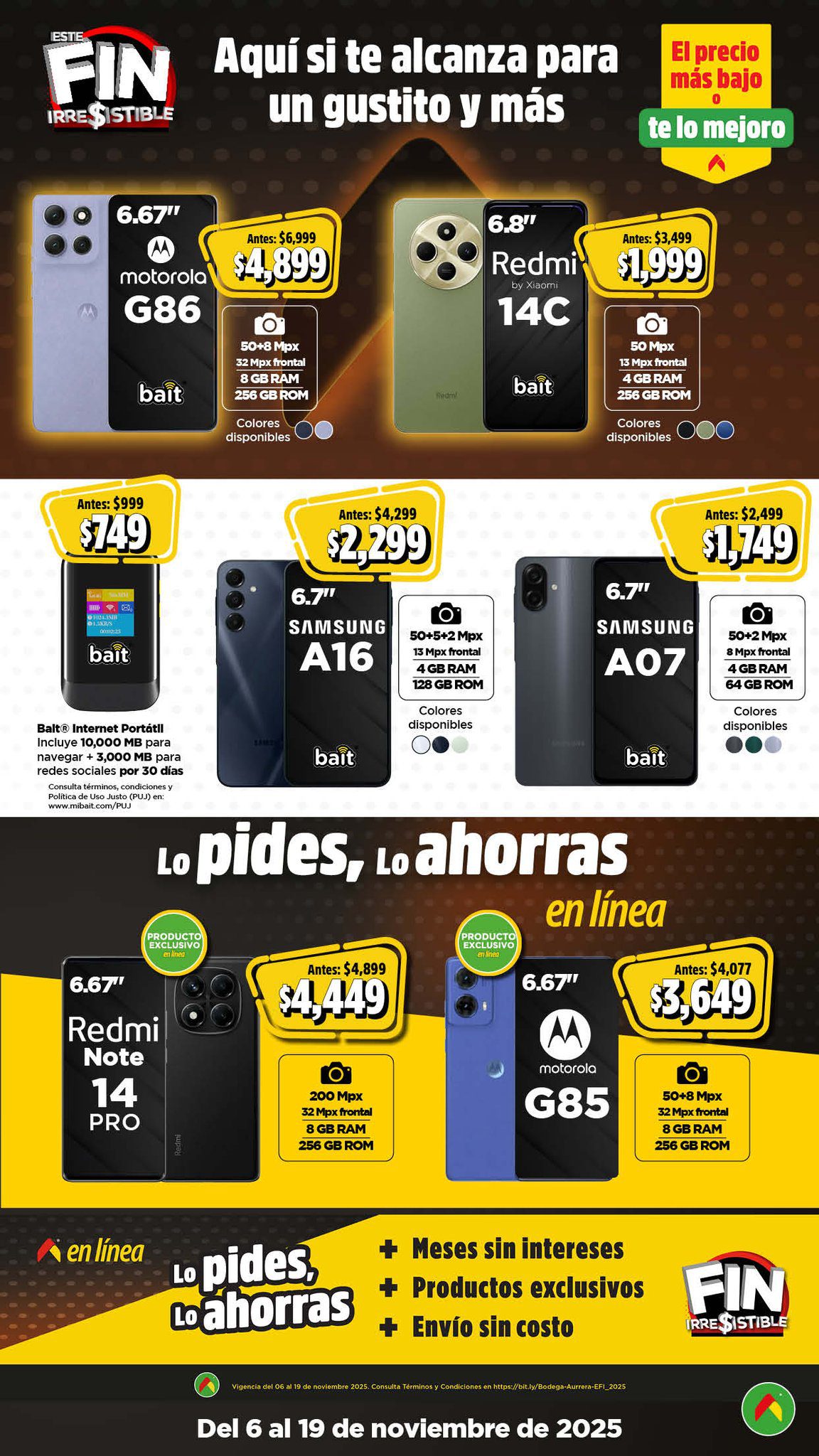 Acabo de ver el folleto Este Fin Irresistible 2025, el Precio más Bajo de México o te lo Mejoro de las tiendas de autoservicio Bodega Aurrera, que contiene sus ofertas válidas del 06 al 19 de noviembre de 2025 en el que encontrarás hasta un 40% de Ahorro + un 15% de descuento adicional en productos seleccionados, usando el cupón AHORRA15BA (exclusivo en línea), Precios especiales, hasta un 20% de Bonificación en Cashi, un 10% de Bonificación en Cashi si pagas con tu Programa o Beca del Bienestar y hasta 20 Meses sin intereses con tarjetas participantes; las ofertas son válidas en su tienda en línea www.bodegaaurrera.com.mx/inicio, en su App (que puedes descargar en estos enlaces: para Google Play o para App Store) y en sus sucursales físicas. Este es su folleto:
