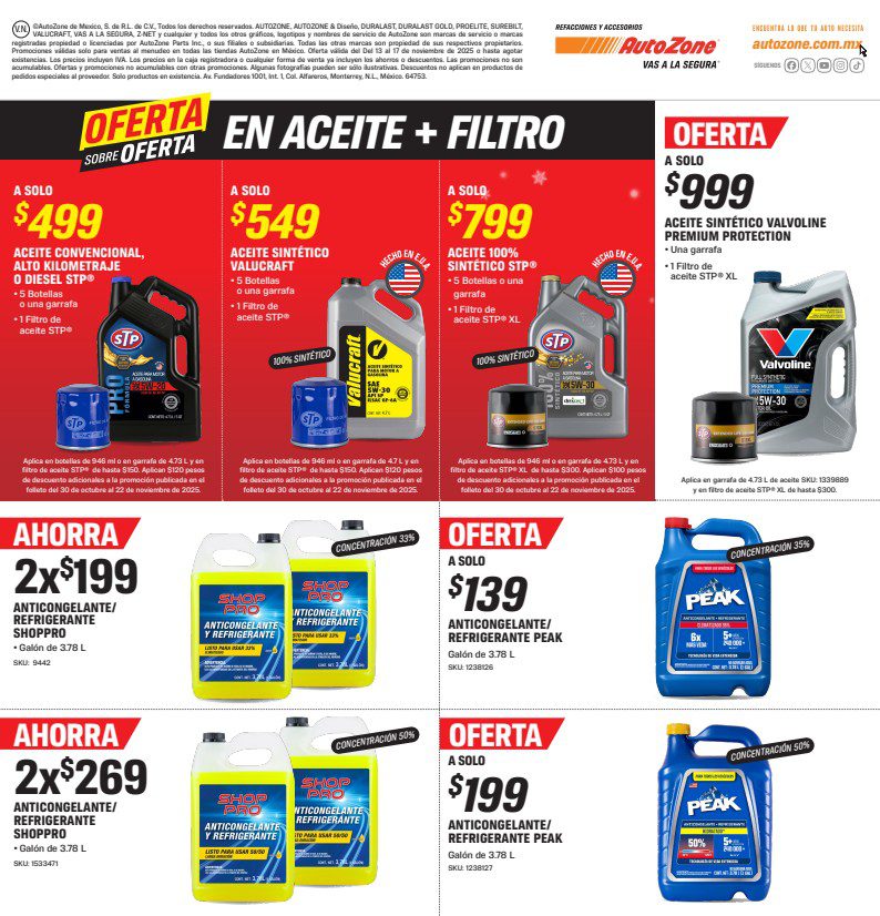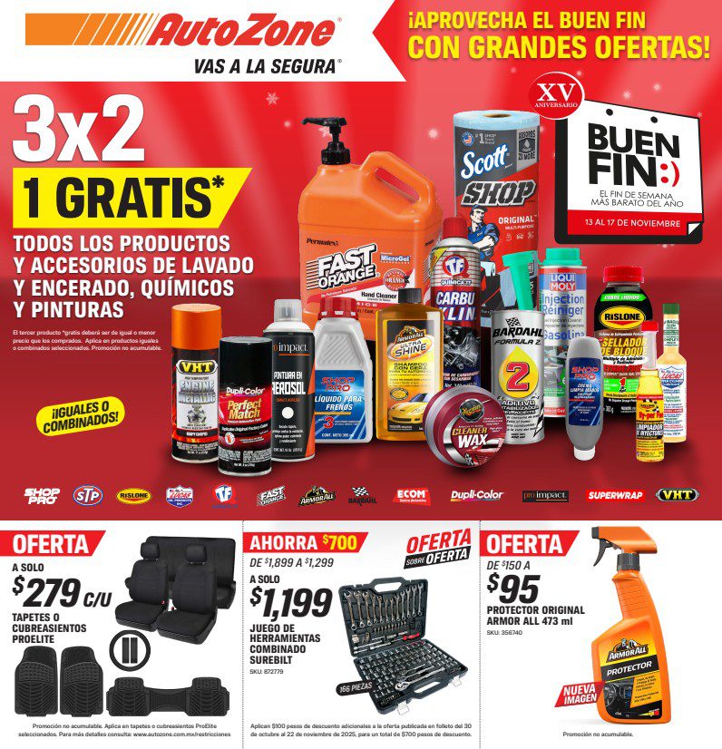 Hace un momento vi el folleto del Buen Fin 2025, de AutoZone, que contiene sus ofertas válidas del 13 al 17 de noviembre de 2025 o hasta agotar existencias, y en el que encontrarás un 3×2, Producto Gratis en la compra de artículos seleccionados, Ahorros especiales en la compra de determinados importes y Precios especiales; la ofertas son válidas en artículos seleccionados y aplican en todas sus sucursales físicas.