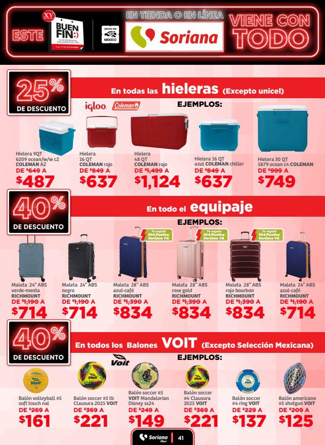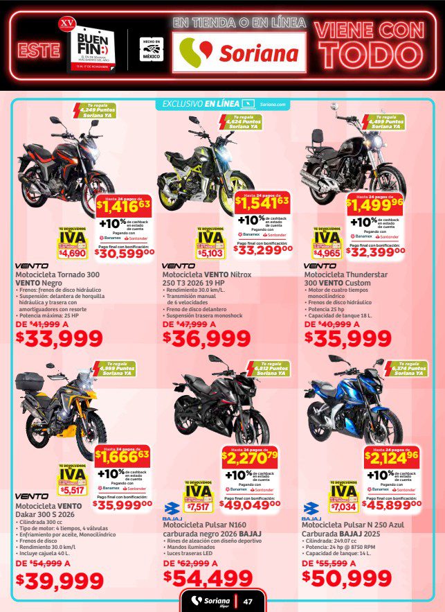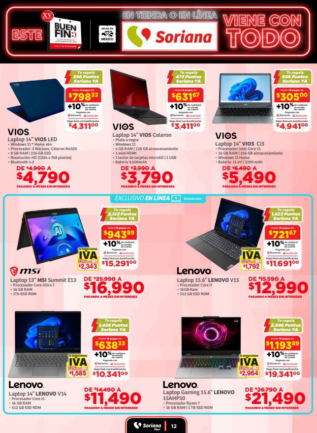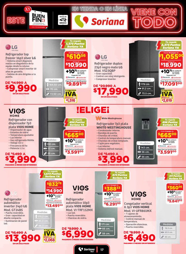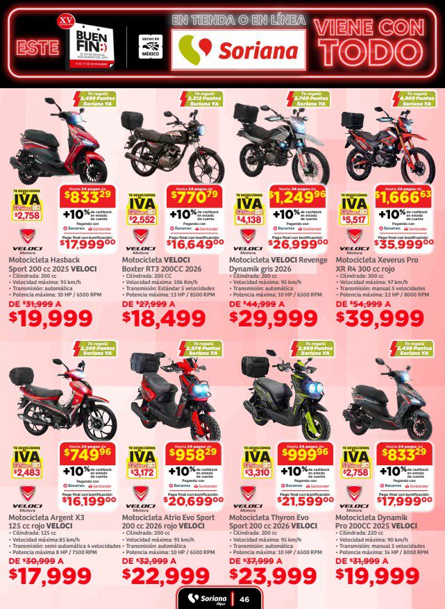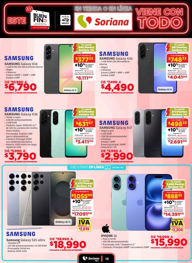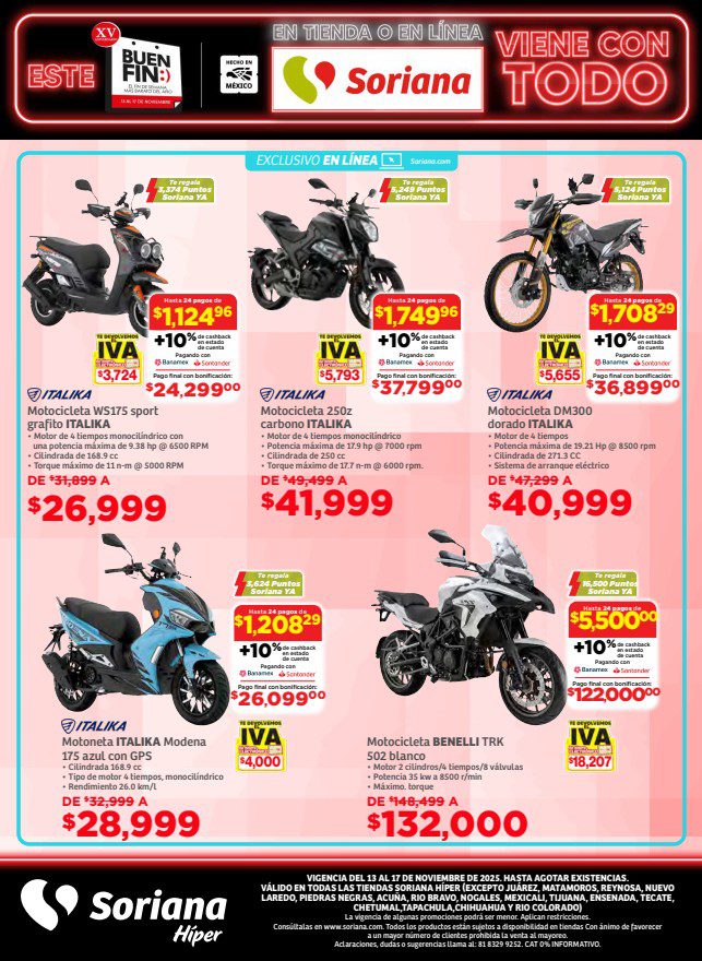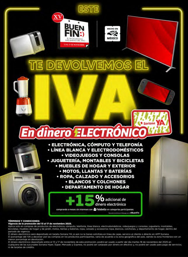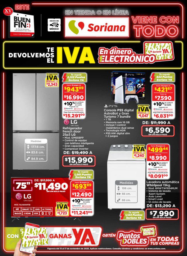 Te comparto el folleto Este Fin Soriana Viene con Todo por el Buen Fin 2025 de Soriana Híper, que contiene sus ofertas válidas del 13 al 17 de noviembre de 2025 o agotar existencias, y en el que te devolverán el IVA en Dinero electrónico Soriana Ya, Puntos Dobles Soriana Ya en todas tus compras, un 2×1, 3×2 (el producto GRATIS será el de igual o menor precio), hasta un 50% de descuento, Precios especiales, hasta 18 Meses sin intereses y Cashback, Devoluciones o Bonificaciones con tarjetas participantes; las ofertas son válidas en artículos seleccionados y aplican en su tienda en línea soriana.com y en sus sucursales físicas participantes.