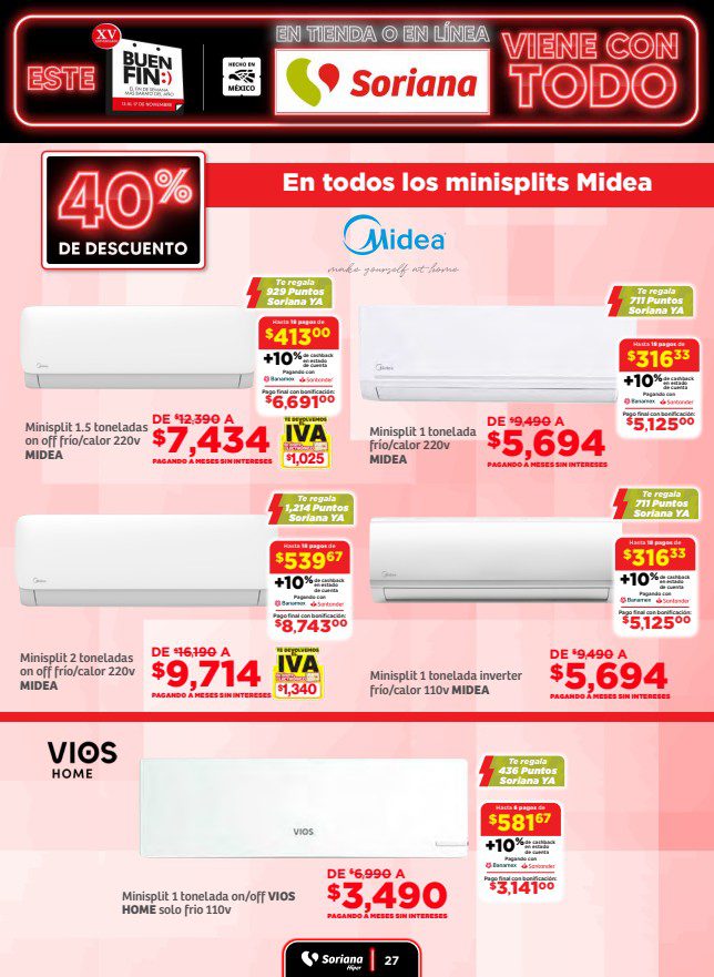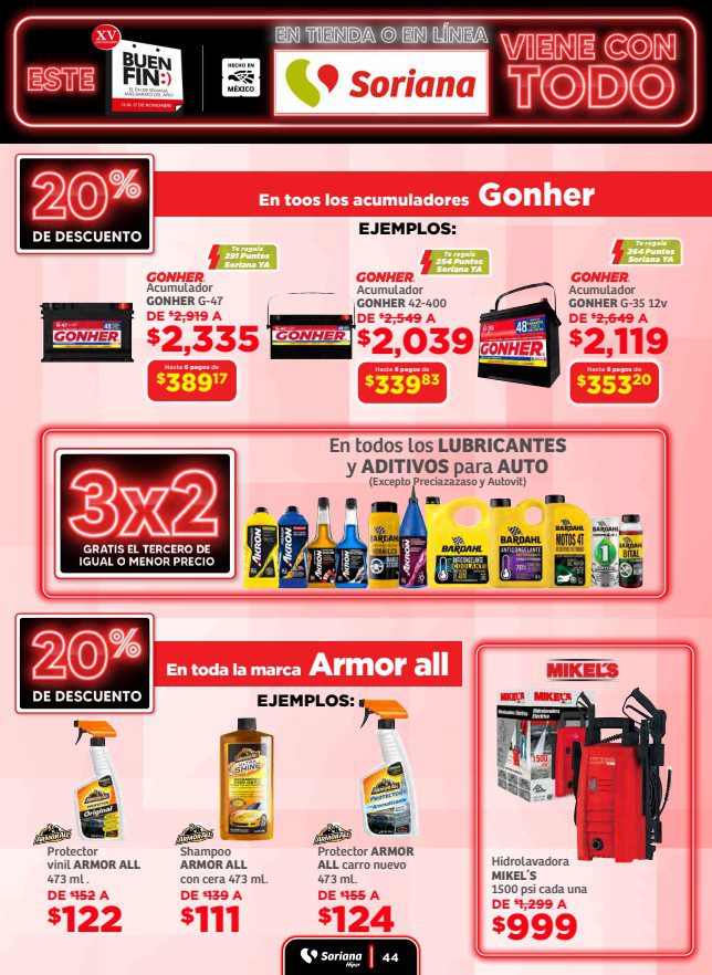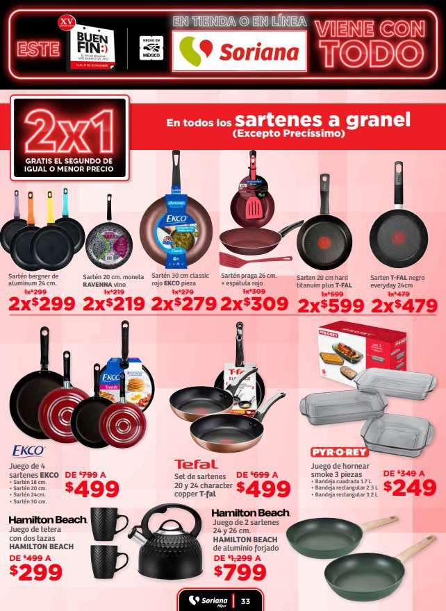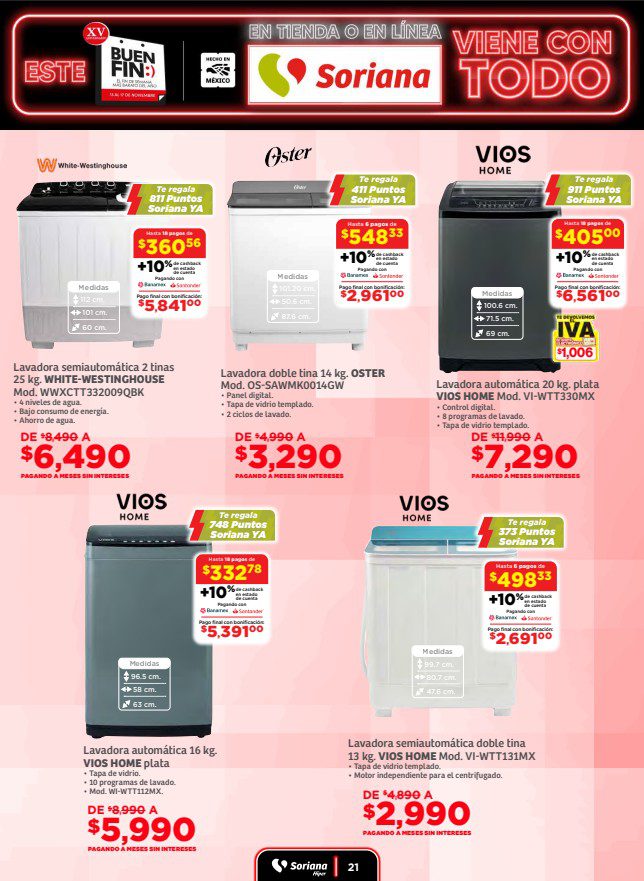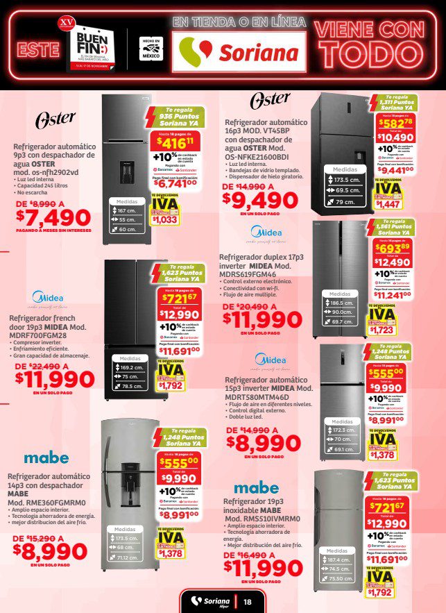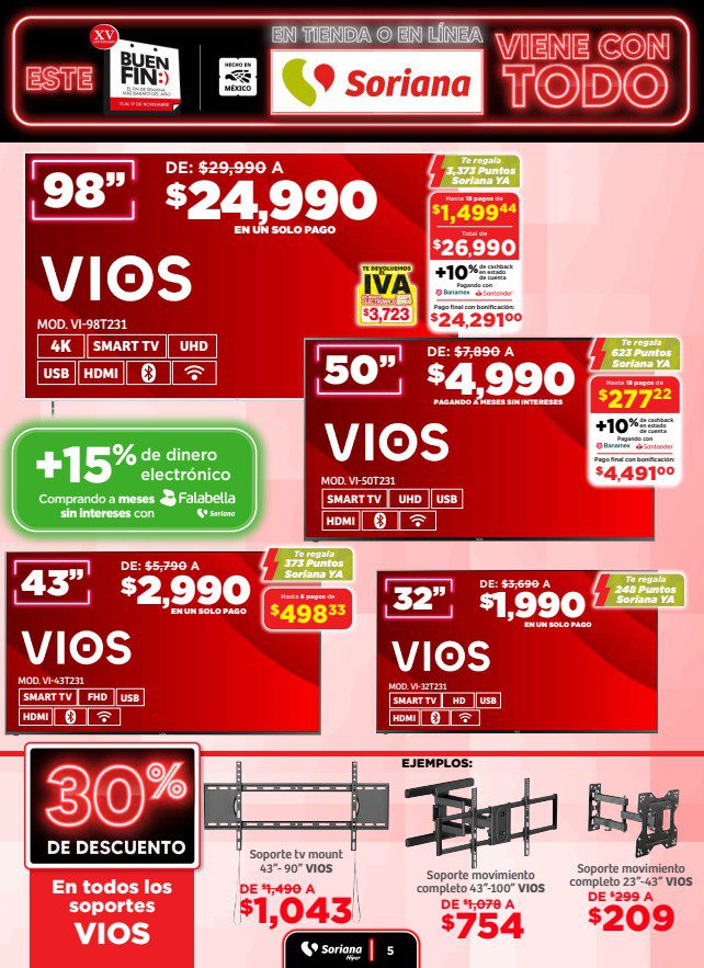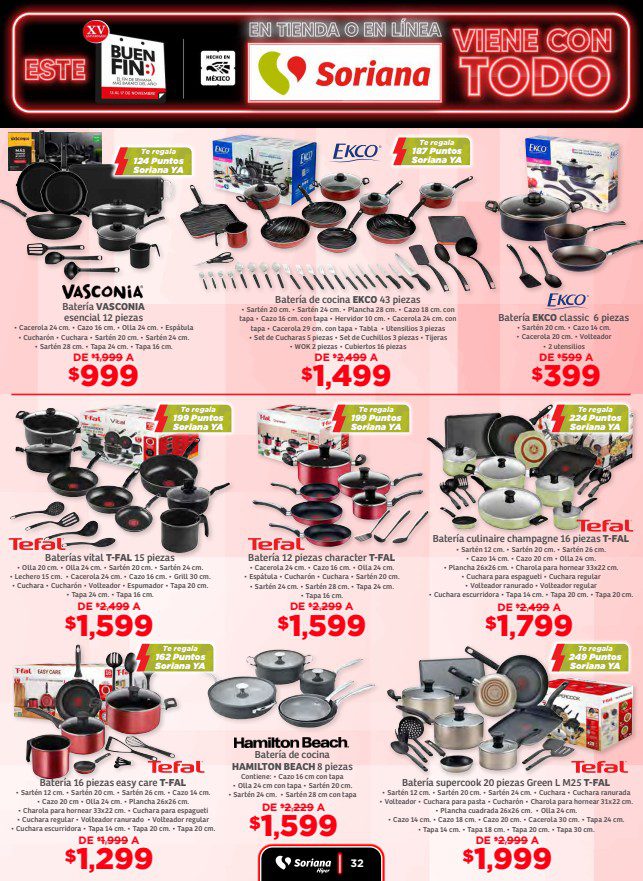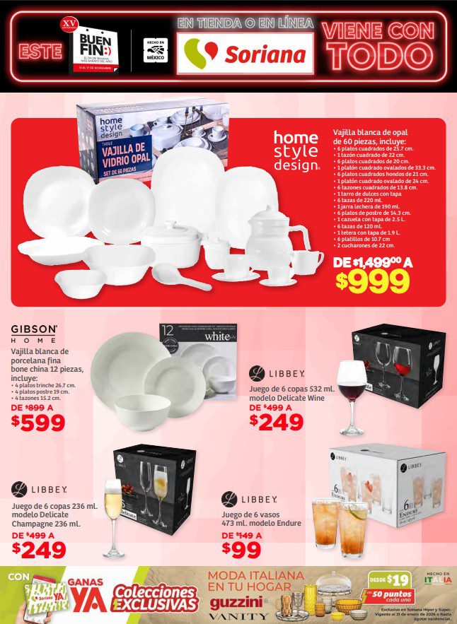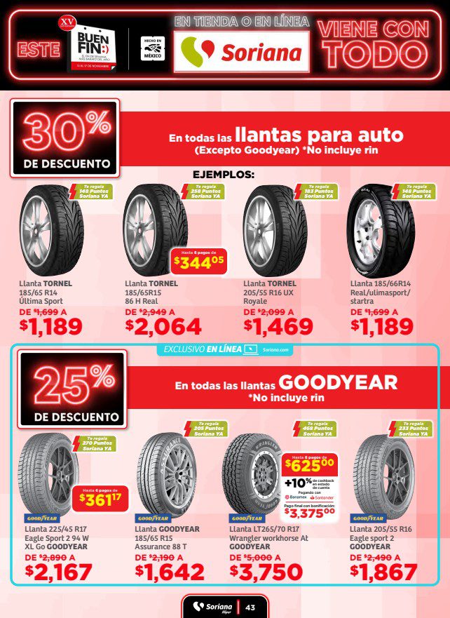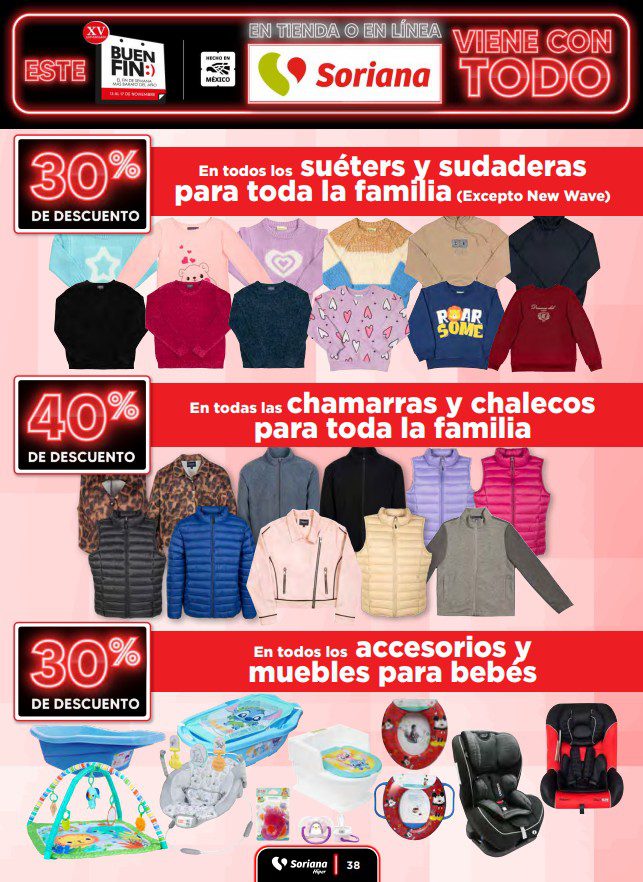 Te comparto el folleto Este Fin Soriana Viene con Todo por el Buen Fin 2025 de Soriana Híper, que contiene sus ofertas válidas del 13 al 17 de noviembre de 2025 o agotar existencias, y en el que te devolverán el IVA en Dinero electrónico Soriana Ya, Puntos Dobles Soriana Ya en todas tus compras, un 2×1, 3×2 (el producto GRATIS será el de igual o menor precio), hasta un 50% de descuento, Precios especiales, hasta 18 Meses sin intereses y Cashback, Devoluciones o Bonificaciones con tarjetas participantes; las ofertas son válidas en artículos seleccionados y aplican en su tienda en línea soriana.com y en sus sucursales físicas participantes.