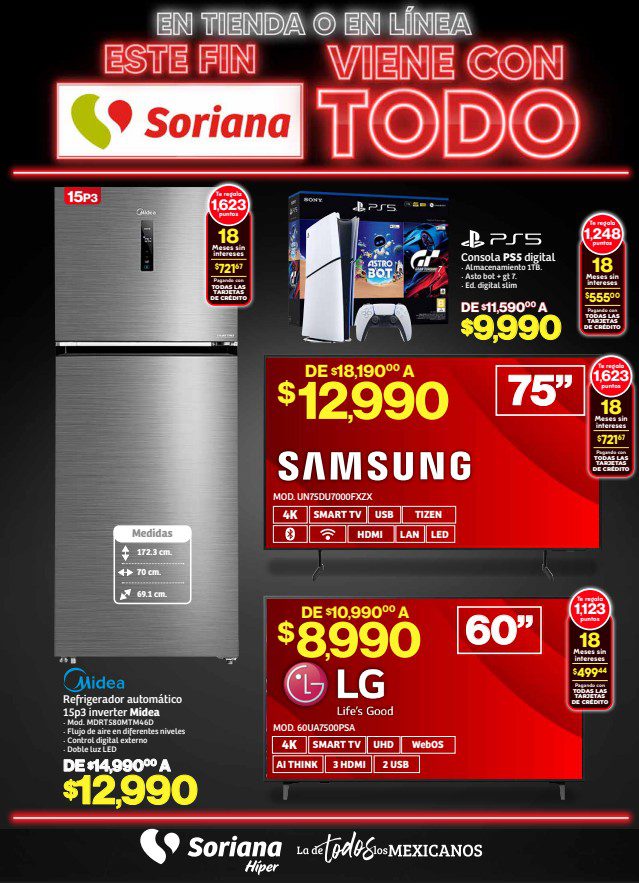 Te comparto el folleto Este Fin Soriana Viene con Todo por el Buen Fin 2025 de Soriana Híper, que contiene sus ofertas válidas del 29 de octubre al 5 de noviembre de 2025 o agotar existencias, y en el que encontrarás un 2×1 (el producto GRATIS será el de igual o menor precio), hasta un 50% de descuento, Precios especiales y hasta 18 Meses sin intereses; las ofertas son válidas en artículos seleccionados y aplican en su tienda en línea soriana.com y en sus sucursales físicas participantes.