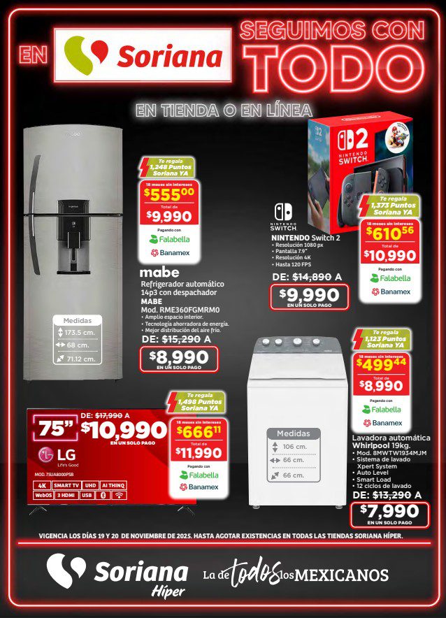 Te comparto el folleto Seguimos con Todo por el Buen Fin Extendido 2025 de Soriana Híper y Súper, que contiene sus ofertas válidas del 19 al 20 de noviembre de 2025 o agotar existencias, y en el que encontrarás un 3×2 (el producto GRATIS será el de igual o menor precio), hasta un 50% de descuento, Precios especiales y hasta 18 Meses sin intereses con tarjetas de crédito participantes; las ofertas son válidas en artículos seleccionados y aplican en su tienda en línea soriana.com y en sus sucursales físicas participantes.