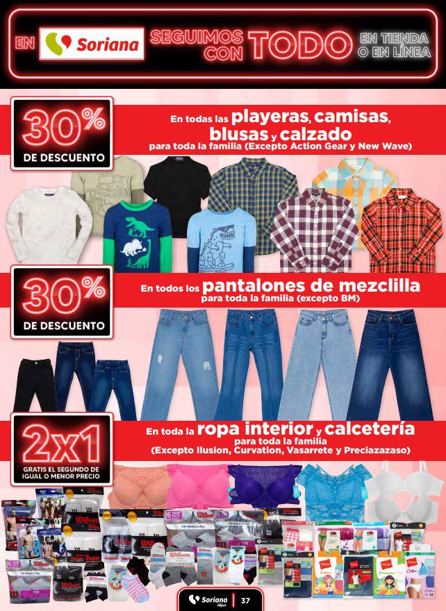 - Todas las Playeras, Camisas, Blusas y Calzado para toda la Familia (excepto Action Gear y New Wave)