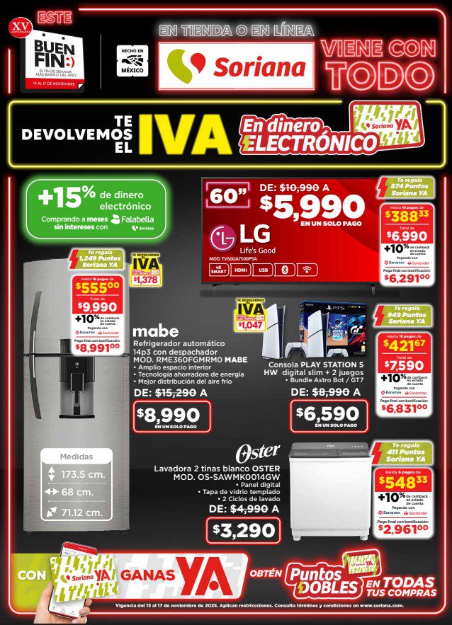 Estoy viendo que Soriana Mercado y Express publicaron su folleto Este Fin Soriana Viene con Todo por el Buen Fin 2025, que contiene sus ofertas válidas del 13 al 17 de noviembre de 2025, y en el que te devolverán el IVA en Dinero electrónico Soriana Ya, Puntos Dobles Soriana Ya en todas tus compras, un 2×1, 3×2, hasta un 40% de descuento, Precios especiales, hasta 18 Meses sin intereses y Cashback, Devoluciones o Bonificaciones con tarjetas participantes; las ofertas aplican en productos seleccionados y son válidas en sus sucursales físicas participantes.