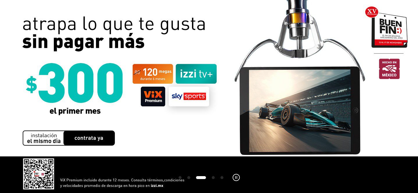 Hace unos minutos me percaté que la empresa de telefonía, internet y televisión por cable Izzi, con su promoción del Buen Fin 2025, te ofrece su Paquete con 120 megas durante 6 meses + Izzi TV + Vix Premium durante 12 meses y Sky Sports por solo $300.00 el primer mes; la promoción estará vigente hasta hoy lunes 17 de noviembre de 2025 y es válida en su página de Internet www.izzi.mx/home/.