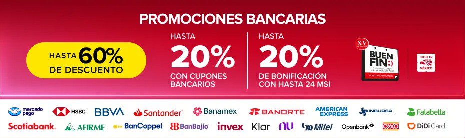 Hace un momento vi que Mercado Libre anunció su promoción por El Buen Fin 2025, en la que te estarán dando hasta un 60% de descuento + hasta un 20% en Cupones bancarios + hasta un 20% de Bonificación con hasta 24 Meses sin intereses con tarjetas participantes; la promoción aplica en productos seleccionados, es válida en su sitio web mercadolibre.com.mx y en su App (que puedes descargar desde esa misma página) y estará vigente del 13 al 17 de noviembre de 2025.