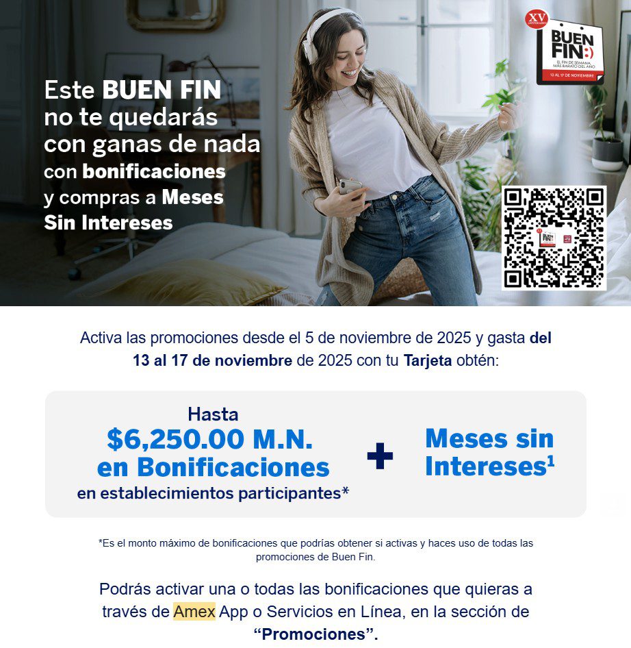 Desde el jueves 13 y hasta el lunes 17 de noviembre de 2025, estará la promoción del Buen Fin 2025, y American Express te ofrece hasta $6,250.00 en Bonificaciones en Establecimientos participantes + Meses sin intereses; la promoción aplica en compras con tu tarjeta American Express Company, deberás Activar la promoción (a partir del 05 de noviembre) en tu Amex App (la puedes descargar en este enlace: americanexpress.com/mx/servicios/digital/amex-app/) con una o todas las bonificaciones que quieras.