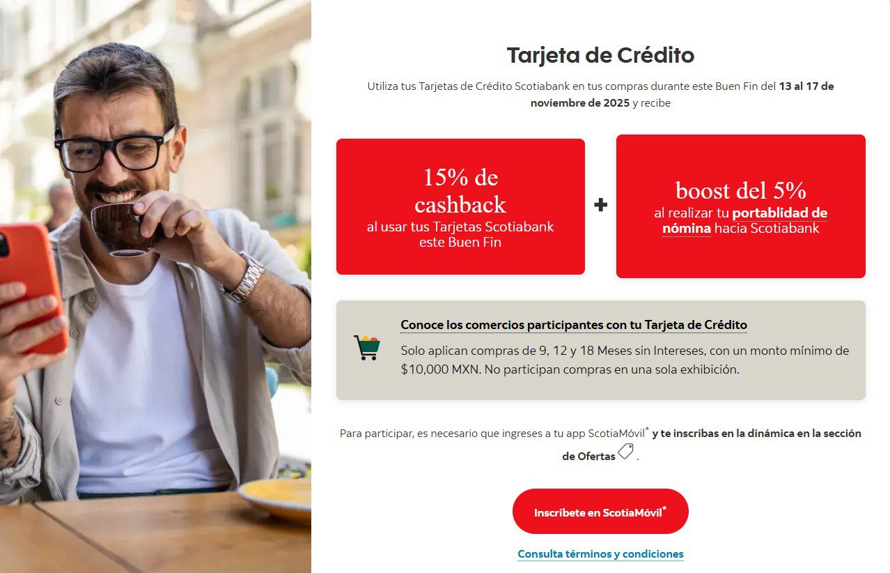 Les aviso que Scotiabank con su promoción por el Buen Fin 2025, está ofreciendo un 15% de Cashback + un 5% adicional si realizas la portabilidad de tu nómina hacia Scotianank; la promoción aplica en compras de 9, 12 y 18 Meses sin Intereses, con un monto mínimo de $10,000.00 con tu Tarjeta de Crédito Scotiabank + hasta 18 Meses sin intereses en negocios participantes, es indispensable que te inscribas en la dinámica en la sección de Ofertas de tu app ScotiaMóvil (la puedes descargar desde su sitio web www.scotiabank.com.mx/promociones/buenfin.aspx), es válida en comercios participantes y cuenta con una vigencia del 13 al 17 de noviembre de 2025.