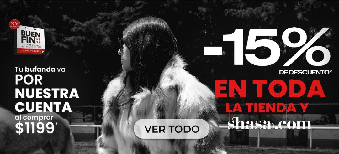 La promoción del Buen Fin 2025 de las tiendas de productos de moda Shasa, te está ofreciendo un 15% de descuento adicional en toda la tienda + 3 y 6 Meses sin intereses con tarjetas de crédito participantes + Promociones Bancarias; la promoción es válida en su página de Internet Shasa.com y en sus sucursales físicas y cuenta con una vigencia del 13 al 17 de noviembre de 2025.