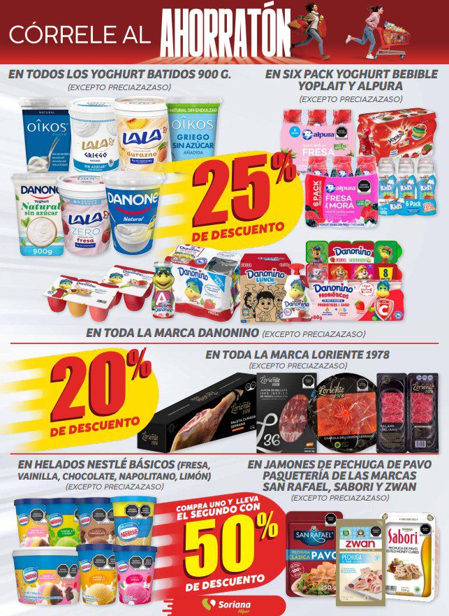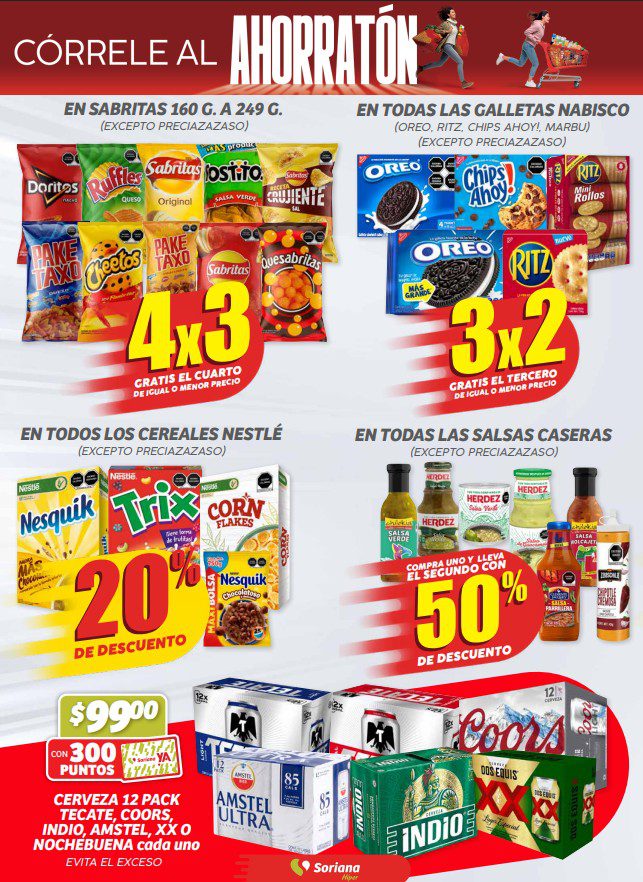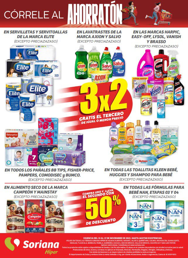 Acabo de ver el folleto de Córrele al Ahorratón del Buen Fin 2025 de Soriana Híper y Súper, que contiene sus ofertas válidas del 13 al 17 de noviembre de 2025 o agotar existencias, y en el que encontrarás 3×2, 4×3 (el producto GRATIS será el de igual o menor precio), hasta un 35% de descuento y Precios especiales; las ofertas son válidas en artículos seleccionados y aplican en sus sucursales físicas participantes y en su tienda en línea www.soriana.com.