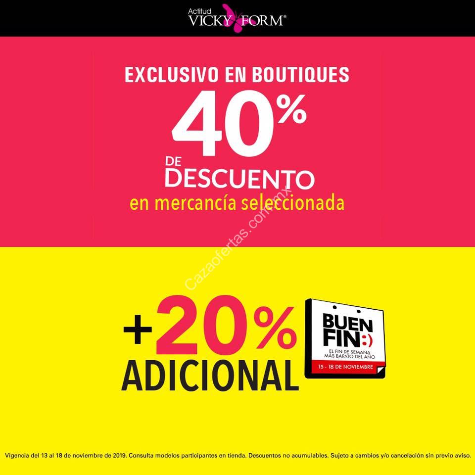 Ya inició la promoción del Buen Fin 2019 en Vicky Form, en la que te ofrecen un 40% de descuento en mercancía seleccionada + un 20% de descuento adicional; la promoción es válida exclusivamente en sus boutiques con una vigencia del 13 al 18 de noviembre de 2019.