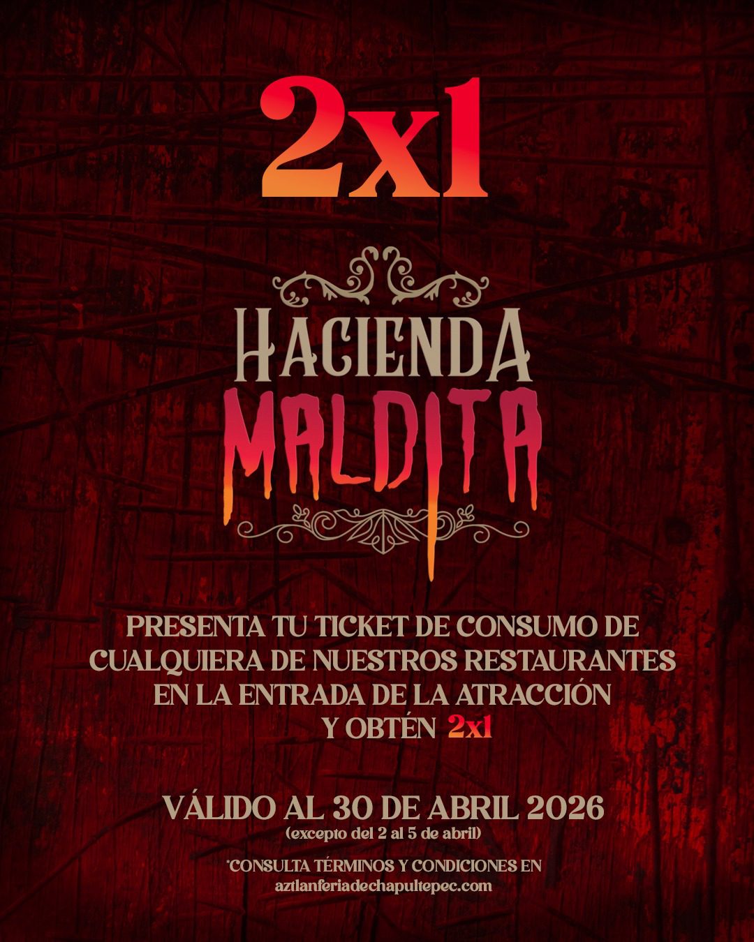 Aztlán Parque Urbano Feria de Chapultepec anunció su promoción ¿Listo para entrar… si te atreves?, en la que si presentas tu Ticket de consumo de cualquiera de sus restaurantes en la entrada de la atracción, te darán un 2×1 en Hacienda Maldita; la promoción es válida en sus taquillas y estará vigente hasta el 30 de abril de 2026.