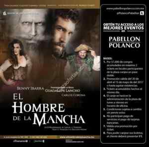 Si tienen ganas de ir a ver la obra de teatro de El Hombre de la Mancha, les aviso que en Pabellón Polanco están regalando boletos. Lo único que tienen que hacer es comprar $1,000 pesos en locales del centro comercial y podrán canjear su ticket o tickets (máximo 2) en el área de administración de la plaza de lunes a viernes. Aplica en compras del centro comercial excepto en bancos, pago de servicios ni pago de tarjetas bancarias.Promoción válida al 15 de mayo, les sugiero que pregunten antes si todavía les quedan boletos por que suelen agotarse antes.