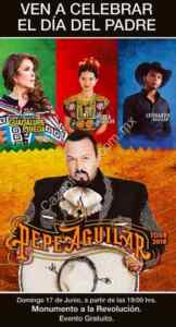 Me acabo de enterar que la Ciudad de México tendrá un concierto gratuito de Pepe Aguilar por el Día del Padre. Este concierto se llevará acabo el domingo 17 de junio en el Monumento a la Revolución a partir de las 19 horas. Para acompañar al cantante se presentarán Guadalupe Pineda y sus hijos Ángela y Leonardo Aguilar. Les recuerdo que este evento es gratis pero lleguen temprano para que estén cerca del escenario.