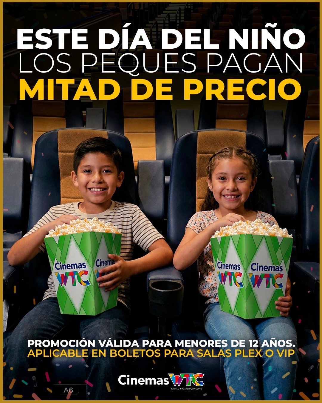 Los Cinemas WTC con su promoción Este Día del Niño se disfruta en grande por el Día del Niño, están ofreciendo que los Niños pagan Mitad de Precio, la promoción aplica para Niños menores de 12 años para Salas Plex o VIP, estará vigente el jueves 30 de abril de 2026 y es válida en las taquillas del Cine.