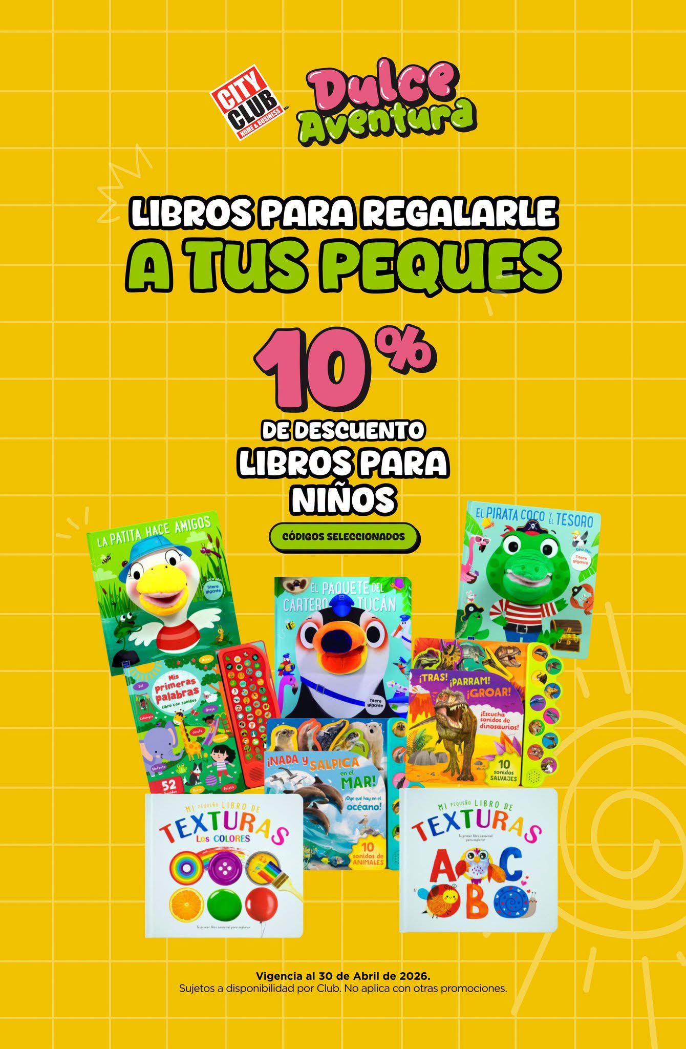 La promoción ¡Historias increíbles para niños increíbles! por el Día del Niño de los clubes de precios City Club, te está ofreciendo un 10% de descuento en Libros para Niños; la promoción aplica en códigos seleccionados, es válida en su tienda en línea www.cityclub.com.mx y en sus clubes físicos y solo estará disponible hasta el 30 de abril de 2026.