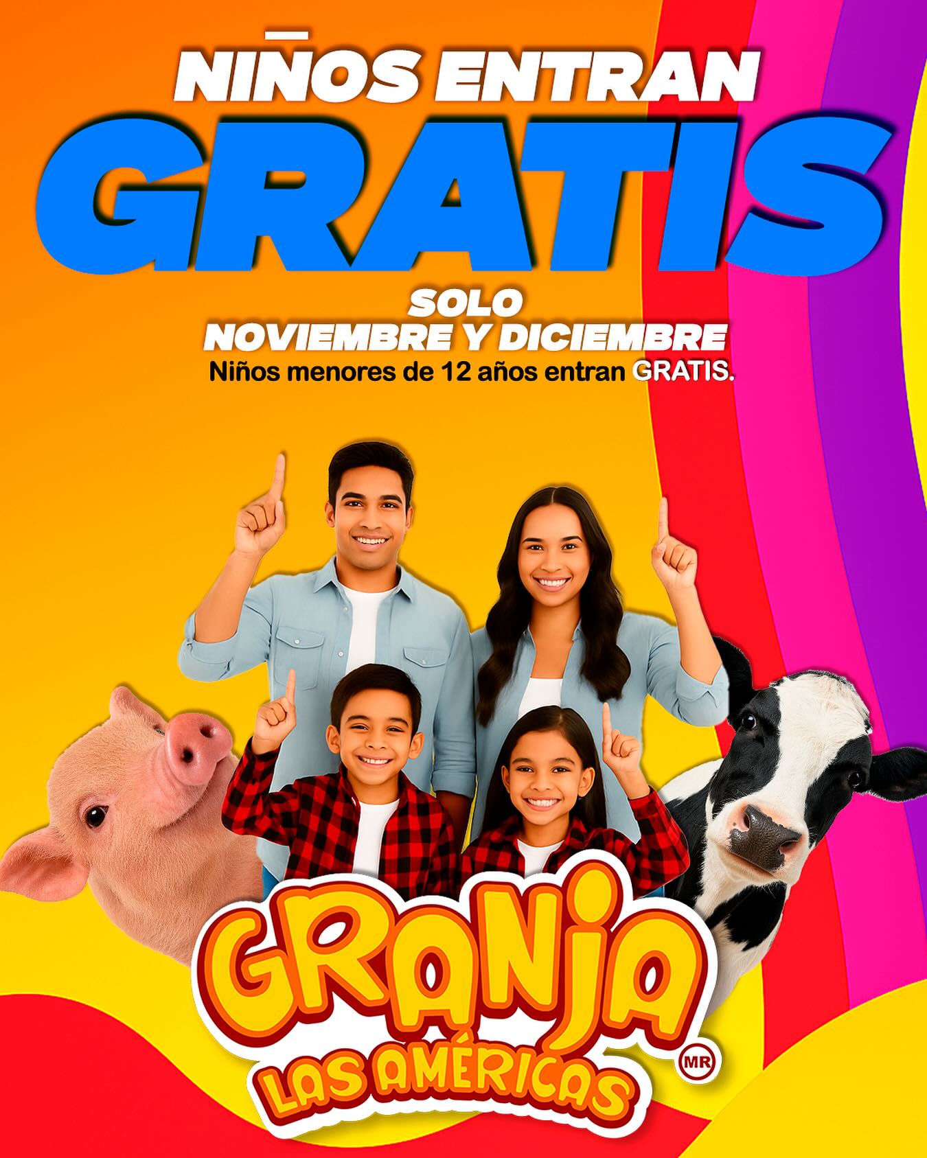 El parque de atracciones Granja Las Américas con su promoción Vengan a disfrutar la experiencia más divertida, está ofreciendo la Entrada Gratis para Niños menores de 12 años; la promoción es válida en las Taquillas del parque y en su sitio web granjalasamericas.com y estará vigente durante Noviembre y Diciembre de 2025.