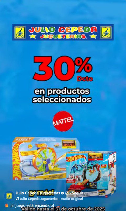 Me acabo de dar cuenta que en las jugueterías Julio Cepeda con su promoción ¡El juego está encendido!, te están ofreciendo un 30% de descuento en Juguetes Mattel participantes, incluyendo Hot Wheels, Barbie, Fisher-Price y más; la promoción aplica en productos seleccionados, estará vigente hasta el 31 de octubre de 2025 y aplica en su sitio de Internet https://juliocepeda.com y en su App (la puedes descargar desde Google Play).
