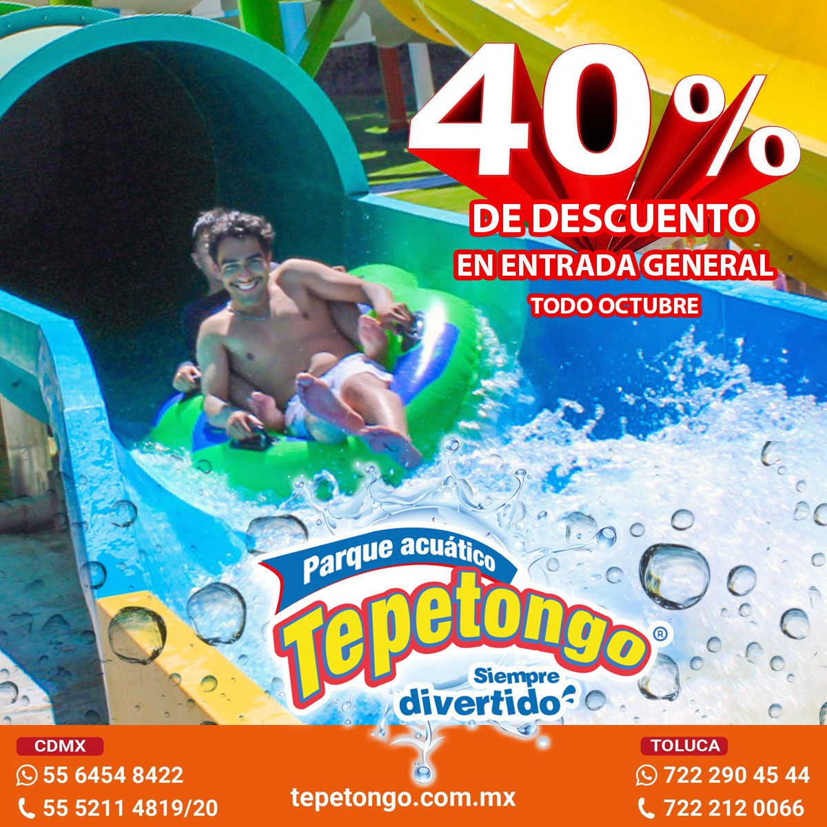 En el parque acuático Tepetongo está su promoción ¡Octubre es el mes ideal para mojarte de emoción!, con la que te estarán dando un 40% de descuento en tu Entrada General; la promoción estará vigente del 01 al 31 de octubre de 2025 y puedes adquirir tus boletos en su página web tepetongo.com.mx ó puedes llamar a los teléfonos 55 6454 8422, 722 212 0066, 555 5211 4820/19 para que te auxilien en tu compra.