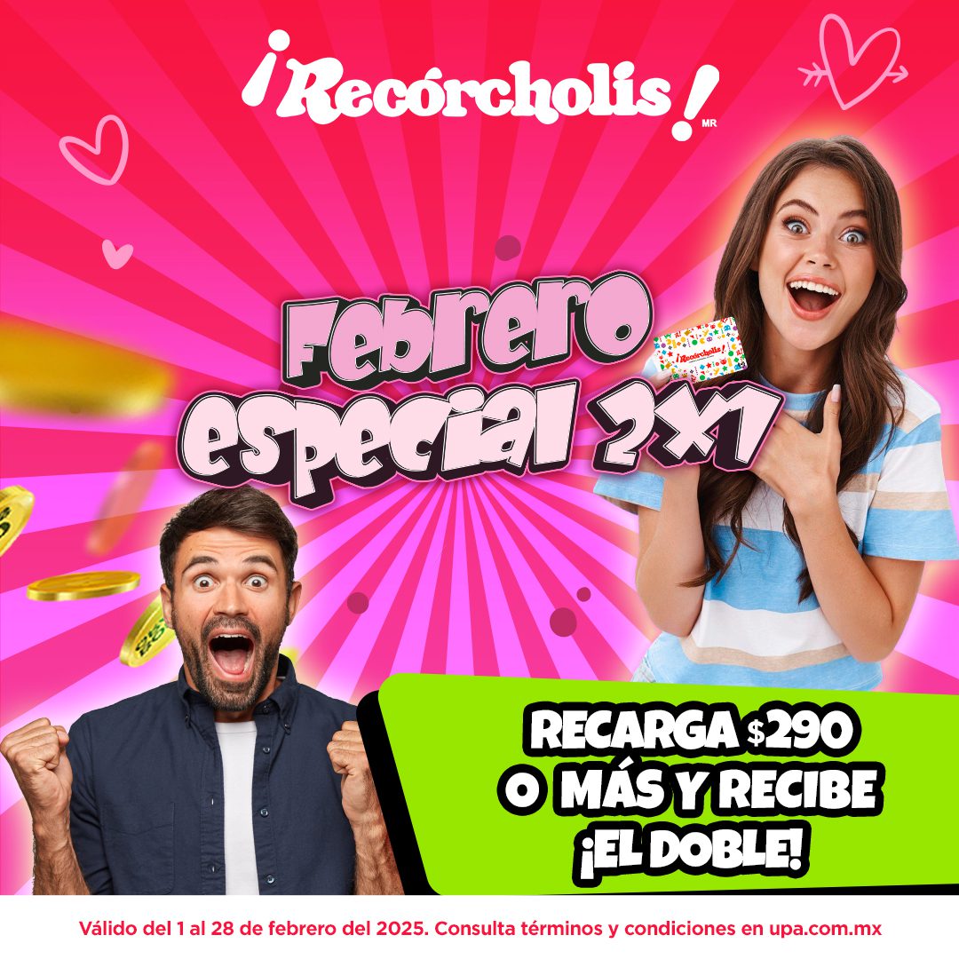 Te comento que en los centros de entretenimiento familiar Recórcholis está su promoción Febrero Especial, en la que están dando un 2×1 en Recargas; la promoción aplica en Recargas de $290.00 o superiores, tiene una vigencia del 01 al 28 de febrero de 2025 y es válida en sus sucursales físicas.