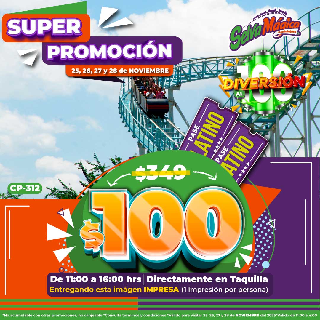 El parque de diversiones Selva Mágica publicó una ¡Super Promoción!, en la que te ofrecen su Pase Platino de $349.00 a solo $100.00; la promoción aplica de las 11:00 a las 16:00 horas, estará vigente del 25 al 28 de noviembre de 2025, y es válida directamente en las Taquillas del parque. Necesitarás presentar impresa la imagen de la promoción (la puedes descargar desde su página de Facebook, a razón de 1 imagen por persona).