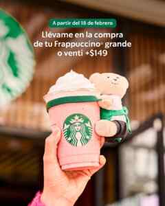 Solo por el día de hoy miércoles 18 de febrero de 2026 y/o hasta agotar existencias, en Starbucks estará una promoción en la que te ofrecen 1 Oso de peluche por $149.00 en la compra de un Frappuccino participante de tamaño Grande (400 ml) o Venti (500ml): Café Frappuccino, Espresso Frappuccino, Mocha Frappuccino, Mocha Blanco Frappuccino, Caramel Frappuccino, Chip Frappuccino, Cookies and Cream Frappuccino, Cajeta Frappuccino, Fresa Cream Frappuccino, Chocolate Cream Frappuccino, Vainilla Cream Frappuccino, Chai Cream Frappuccino, Matcha Cream Frappuccino, Berry Yogurt Frappuccino, Piña coco Yogurt Frappuccino, Chocolate Blanco Frappuccino, Cajeta Cream Frappuccino, Cinnamon Dolce Frappuccino, Cinnamon Dolce Cream Frappuccino, Chocolate Mexicano Frappuccino, Pistache Frappuccino, Pistache Mocha Blanco Frappuccino, Brown Sugar Strato Frappuccino, Salted Caramel Mocha Strato Frappuccino, Fresa Matcha Strato Frappuccino; la promoción aplica en bebidas y tamaños participantes, es válida en sus sucursales físicas Starbucks Coffee. Deberás mencionar la promoción al Barista para que la validen.