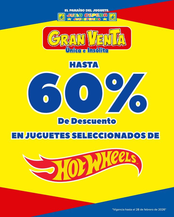 Me acabo de dar cuenta que en las jugueterías Julio Cepeda con su Gran Venta Única e Insólita, te están ofreciendo hasta un 60% de descuento; la promoción aplica en Juguetes seleccionados de Hot Wheels, estará vigente hasta el 28 de febrero de 2026 y aplica tanto en su sitio de Internet https://juliocepeda.com como en sus sucursales físicas.