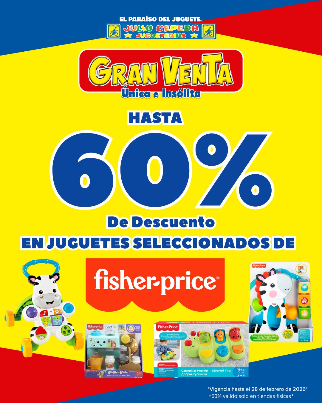 Me acabo de dar cuenta que en las jugueterías Julio Cepeda con su Gran Venta Única e Insólita, te están ofreciendo hasta un 60% de descuento en su selección de Juguetes Fisher-Price; la promoción aplica en Juguetes seleccionados, estará vigente hasta el 28 de febrero de 2026 y aplica solo en sus sucursales físicas.