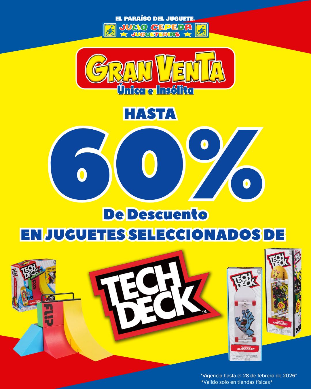 Me acabo de dar cuenta que en las jugueterías Julio Cepeda con su Gran Venta Única e Insólita, te están ofreciendo hasta un 60% de descuento en su selección de productos Tech Deck y otros juguetes; la promoción aplica en Juguetes seleccionados, estará vigente hasta el 28 de febrero de 2026 y aplica en sus sucursales físicas.