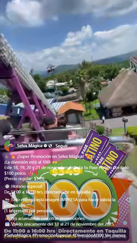 Únicamente hasta el día de hoy viernes 21 de noviembre de 2025, en el parque de diversiones Selva Mágica estará una Super Promoción, en la que podrás adquirir tu Pase Platino de $349.00 a sólo $100.00; la promoción es válida de 11:00 a 16:00 en las taquillas del parque y necesitas presentar impresa la imagen de la promoción (la puedes descargar desde su página de Facebook).