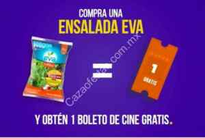 Les comparto esta promoción de Ensaladas Eva. En la compra de una Ensalada Eva Toscana te darán un boleto gratis en Cinemex. Deberás mostrar en taquillas el ticket de compra y el empaque del producto marcado con la promoción. Por cada bolsa que lleves te darán un boleto gratis.