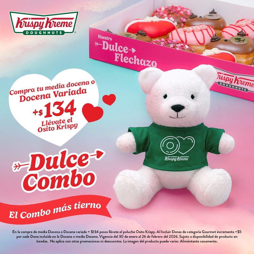 Les comparto la promoción ¡El regalo más tierno y romántico! de Krispy Kreme, en la que si realizas la compra de una Media Docena o Docena variada, te llevarás el Osito Krispy por $134.00 adicionales; la promoción es válida en sus sucursales físicas (que puedes ubicar en este enlace: https://www.krispykreme.mx/directorio-tiendas/) y vía Delivery Krispy Kreme Delivery, y estará vigente del 30 de enero al 26 de febrero de 2026.