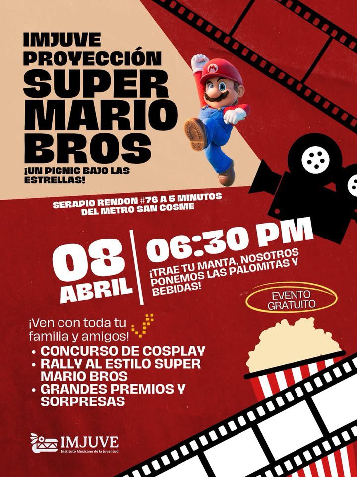 El Instituto Mexicano de la Juventud (IMJUVE), te invita a disfrutar GRATIS de la película Super Mario Bros, ¡Un Picnic bajo las estrellas!, que se realizará hoy martes 08 de abril de 2026 a las 18:30 horas en sus instalaciones (Serapio Rendón #76, a 5 minutos del Metro San Cosme); puedes acudir con toda tu familia, y además, encontrarás actividades como estas: