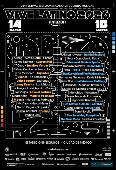 Recuerda que el Vive Latino se realizará el 14 y 15 de marzo de 2026 en el estadio GNP Seguros y contará con la participación de artistas como: Juanes, John Fogerty, Lenny Kravitz, Maldita Vecindad, Moenia, Banda Machos, Fobia, Los Fabulosos Cadillacs, The Smashing Pumpkins y más.
